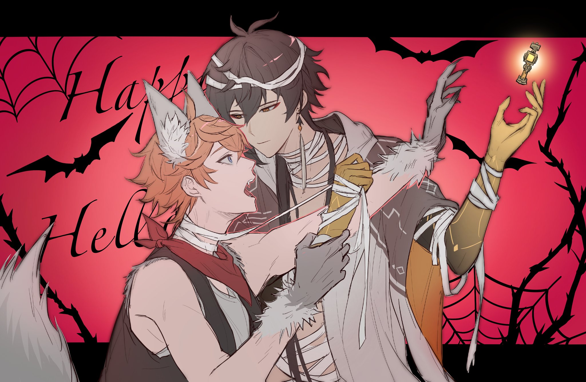 2boys bandages bat_(animal) genshin_impact gnosis_(genshin_impact) halloween happy_halloween highres huachenchenchen multiple_boys mummy mummy_costume silk spider_web tail tartaglia_(genshin_impact) werewolf werewolf_costume wolf_tail yaoi zhongli_(genshin_impact)