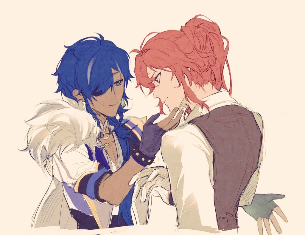 2boys alternate_costume diluc_(genshin_impact) genshin_impact gloves grabbing_another's_chin hand_on_another's_chin hand_on_another's_face high_ponytail huachenchenchen kaeya_(genshin_impact) looking_at_another multiple_boys ponytail twitter white_background yaoi