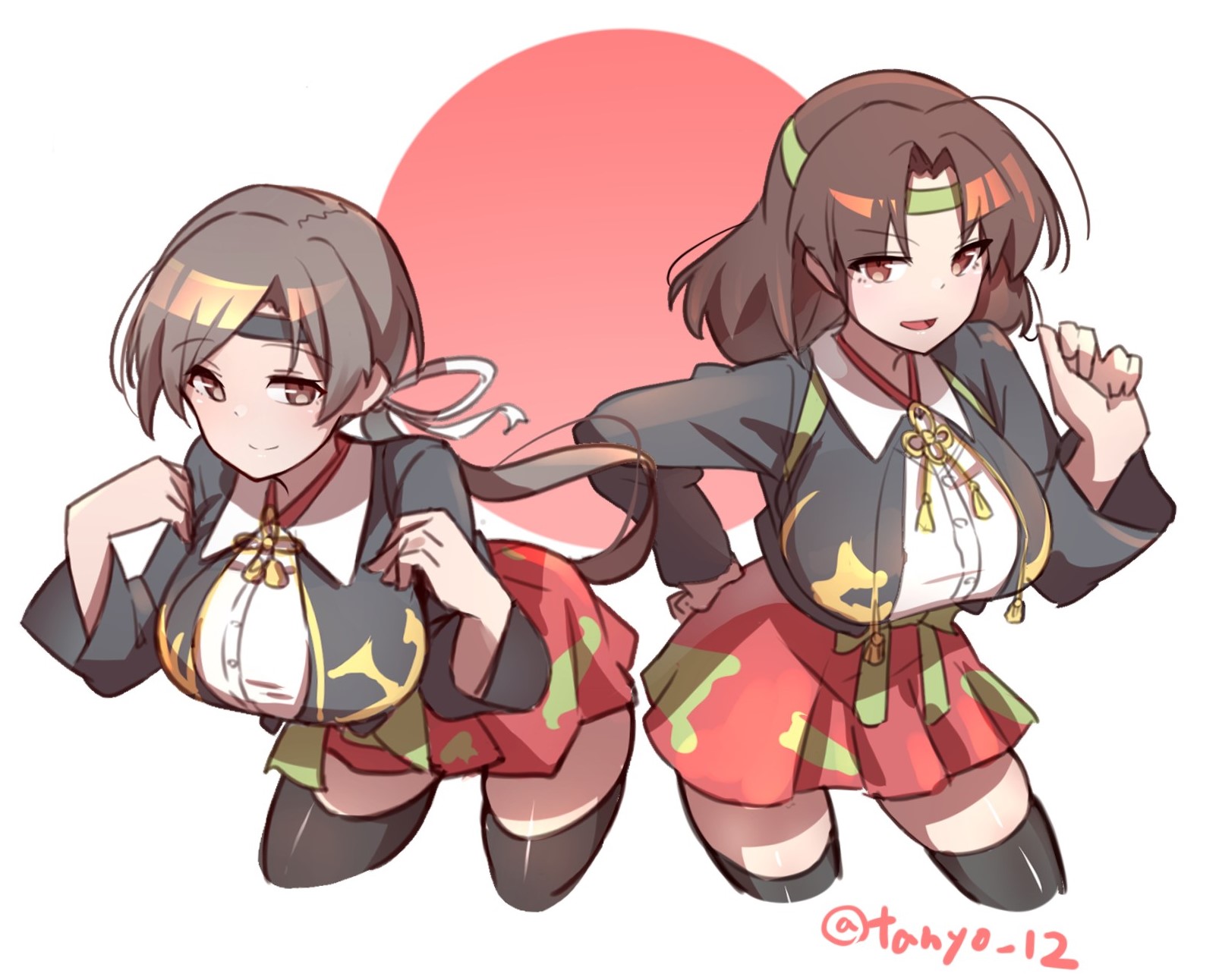 2girls alternate_legwear artist_name black_thighhighs blush breasts brown_hair camouflage camouflage_skirt chitose_(kancolle) chitose_kai_ni_(kancolle) chiyoda_(kancolle) chiyoda_kai_ni_(kancolle) grey_eyes grey_hair hair_ornament hair_ribbon hakama hakama_short_skirt hakama_skirt headband highres jacket japanese_clothes kantai_collection large_breasts long_hair long_sleeves looking_at_viewer multiple_girls ponytail red_hakama revision ribbon shirt short_hair skirt smile tanyou thighhighs twitter_username white_background