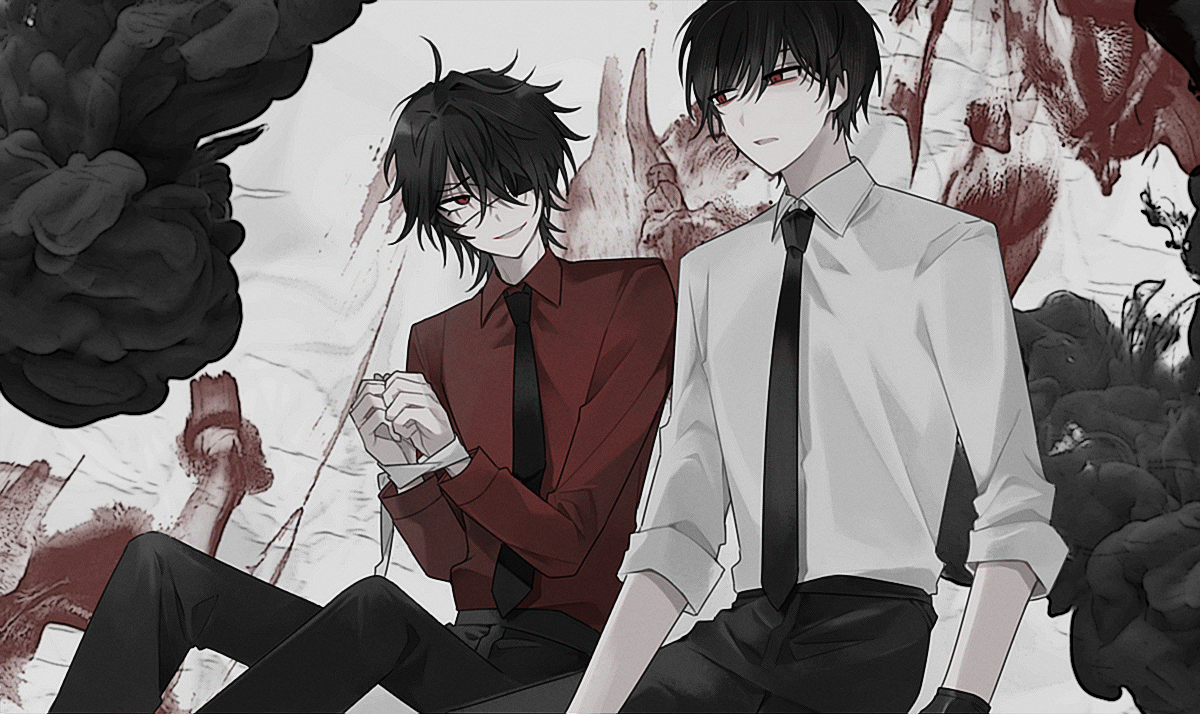 2boys black_gloves black_hair black_necktie black_pants bound bound_wrists collared_shirt eye_contact eyepatch feet_out_of_frame gloves ino_(1hjzuy) long_sleeves looking_at_another male_focus multiple_boys necktie ooe_(game) oosaki_(ooe) open_mouth pants red_eyes red_shirt shinbashi_(ooe) shirt short_hair sitting smile white_background white_shirt