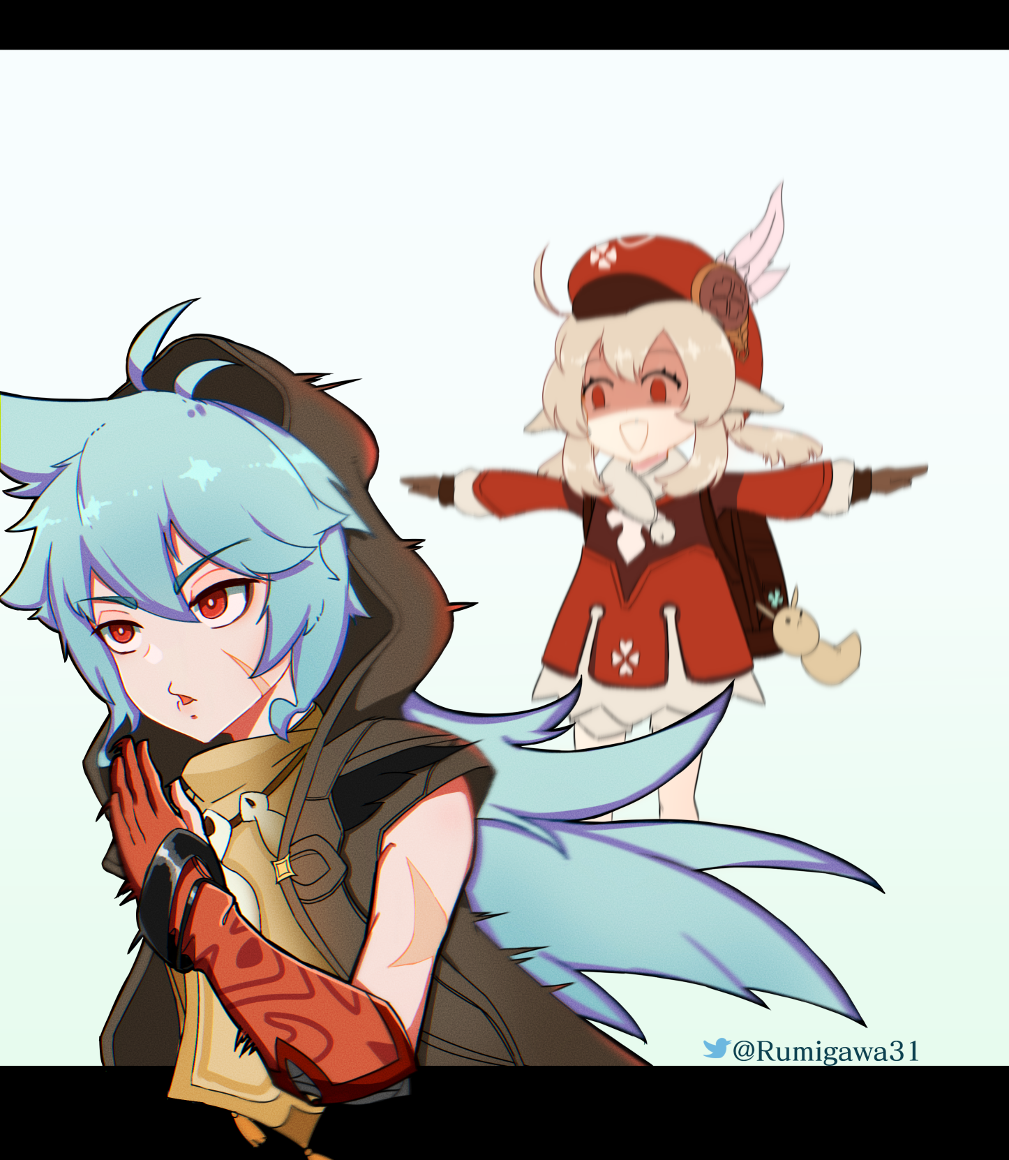 1boy 1girl 2021 blonde_hair blue_hair floating_boy_chasing_running_boy_(meme) genshin_impact highres klee_(genshin_impact) meme razor_(genshin_impact) red_eyes rumi_(rumigawa31) running t-pose