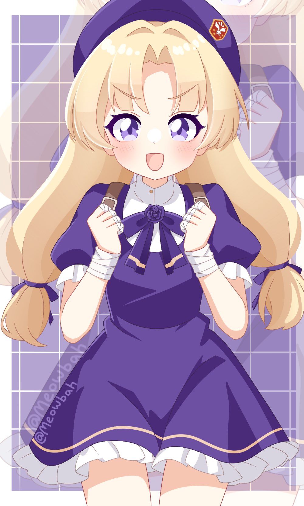 1girl backpack bag bandaged_fingers bandaged_wrist bandages beret blonde_hair cowboy_shot determined dress frills happy hat highres long_hair meowbah open_mouth puffy_short_sleeves puffy_sleeves purple_dress purple_eyes shijou_hinako short_sleeves the_king_of_fighters the_king_of_fighters_xv
