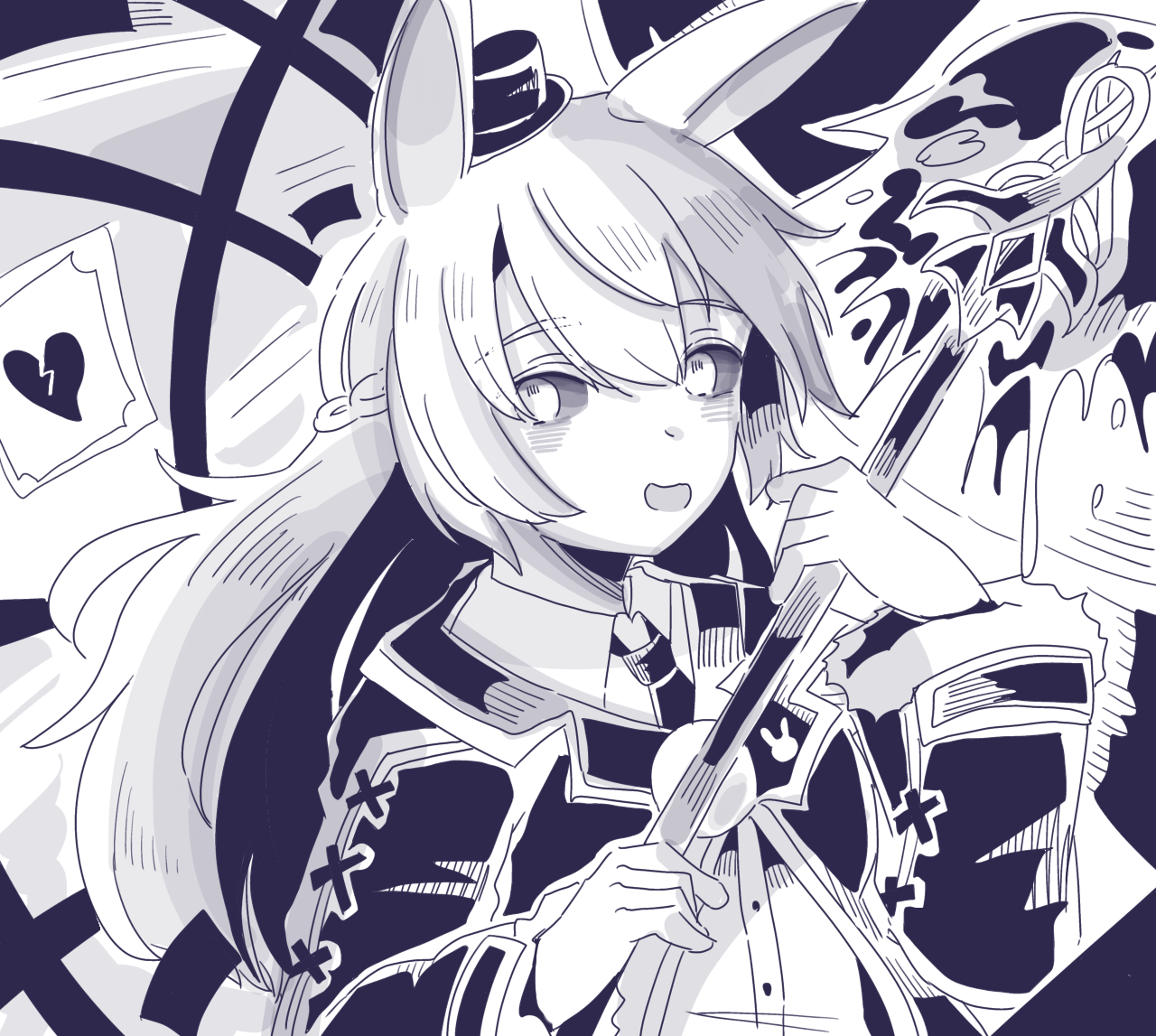 1girl animal_ears black_sclera blush_stickers braid buttons coat colored_sclera grimms_echoes holding holding_staff holding_weapon long_hair long_sleeves necktie open_mouth rabbit_ears smile solo source_request staff user_sjtw2272 void_white_rabbit_(grimms_echoes) weapon