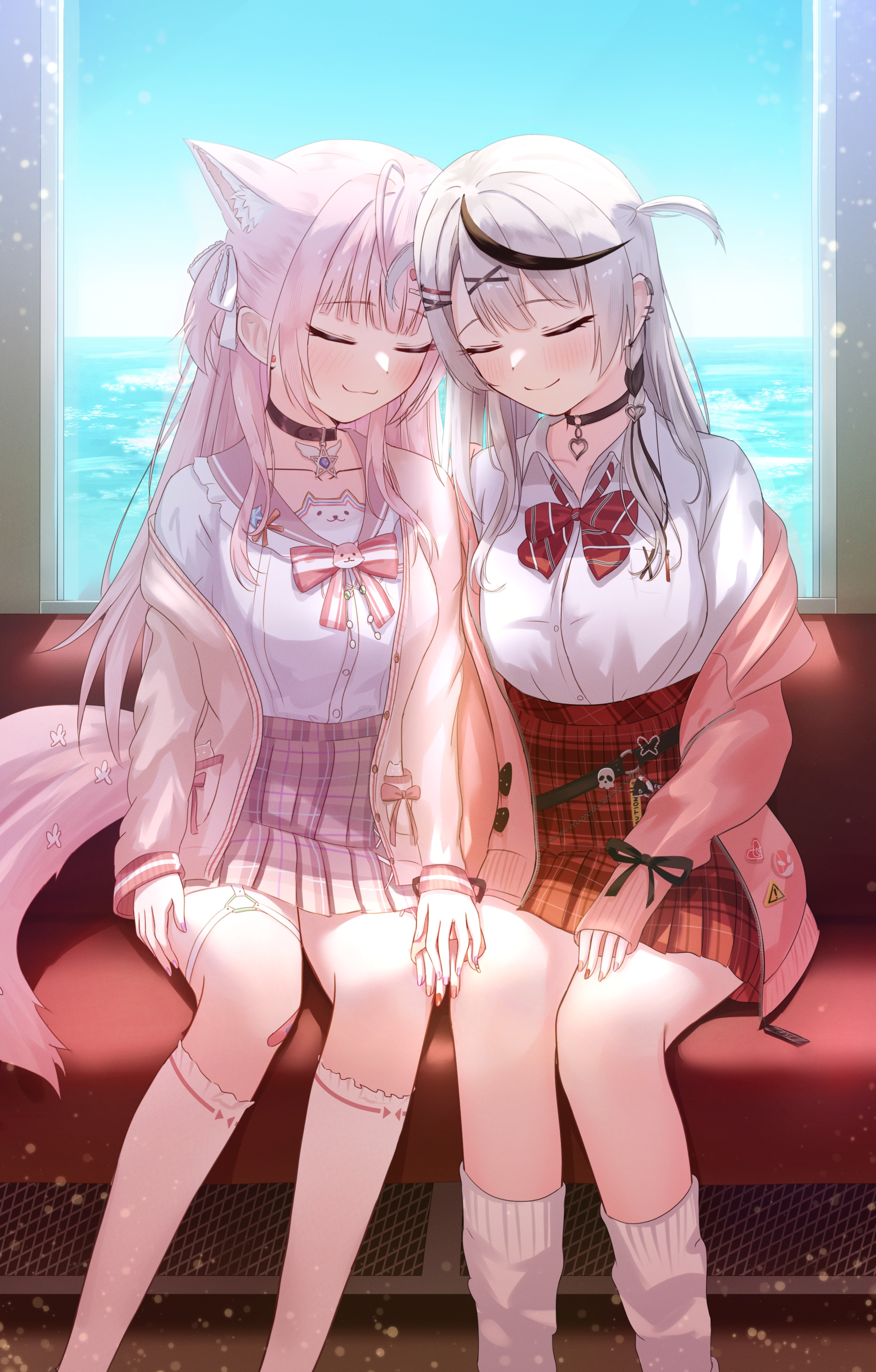 2girls absurdres animal_ears antenna_hair black_choker black_hair blush choker collared_shirt ear_piercing grey_hair hair_ornament hairpin hakui_koyori hakui_koyori_(school_uniform) head_rest highres hololive jacket long_hair multicolored_hair multiple_girls o-ring o-ring_choker official_alternate_costume piercing pink_jacket pink_sailor_collar pink_skirt red_skirt sailor_collar sakamata_chloe sakamata_chloe_(gyarumata) shirt skirt smile socks streaked_hair tail takotakochan_1006 thighhighs two_side_up virtual_youtuber white_shirt white_socks white_thighhighs wolf_ears wolf_girl wolf_tail x_hair_ornament