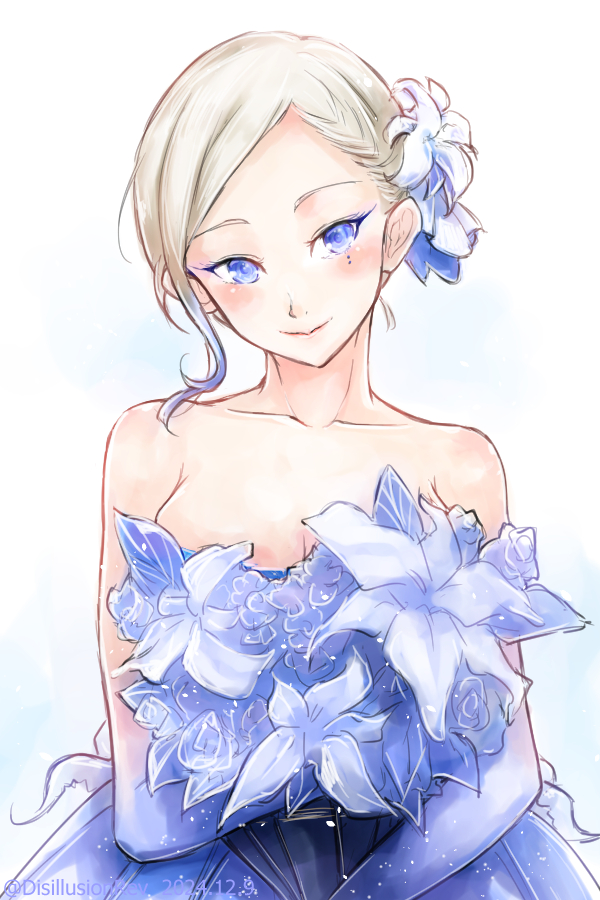 1girl alternate_costume bare_shoulders blonde_hair blue_dress blue_eyes blue_flower blue_gloves braid braided_bangs collarbone dress elbow_gloves flower gloves gradient_background gradient_hair jean_bart_(anniversary)_(kancolle) jean_bart_(kancolle) kamio_(d-rev) kantai_collection multicolored_hair one-hour_drawing_challenge short_hair smile solo strapless strapless_dress upper_body white_background