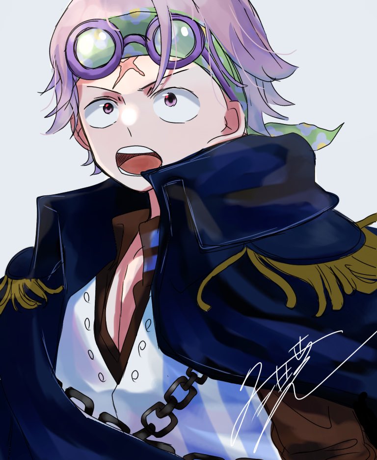 1boy black_coat coat collared_coat epaulettes eyewear_on_head headband koby_(one_piece) looking_ahead male_focus n_fuyuakatsuki one_piece open_mouth pink_hair scar scar_on_face short_hair signature simple_background solo upper_body vest white_background white_vest