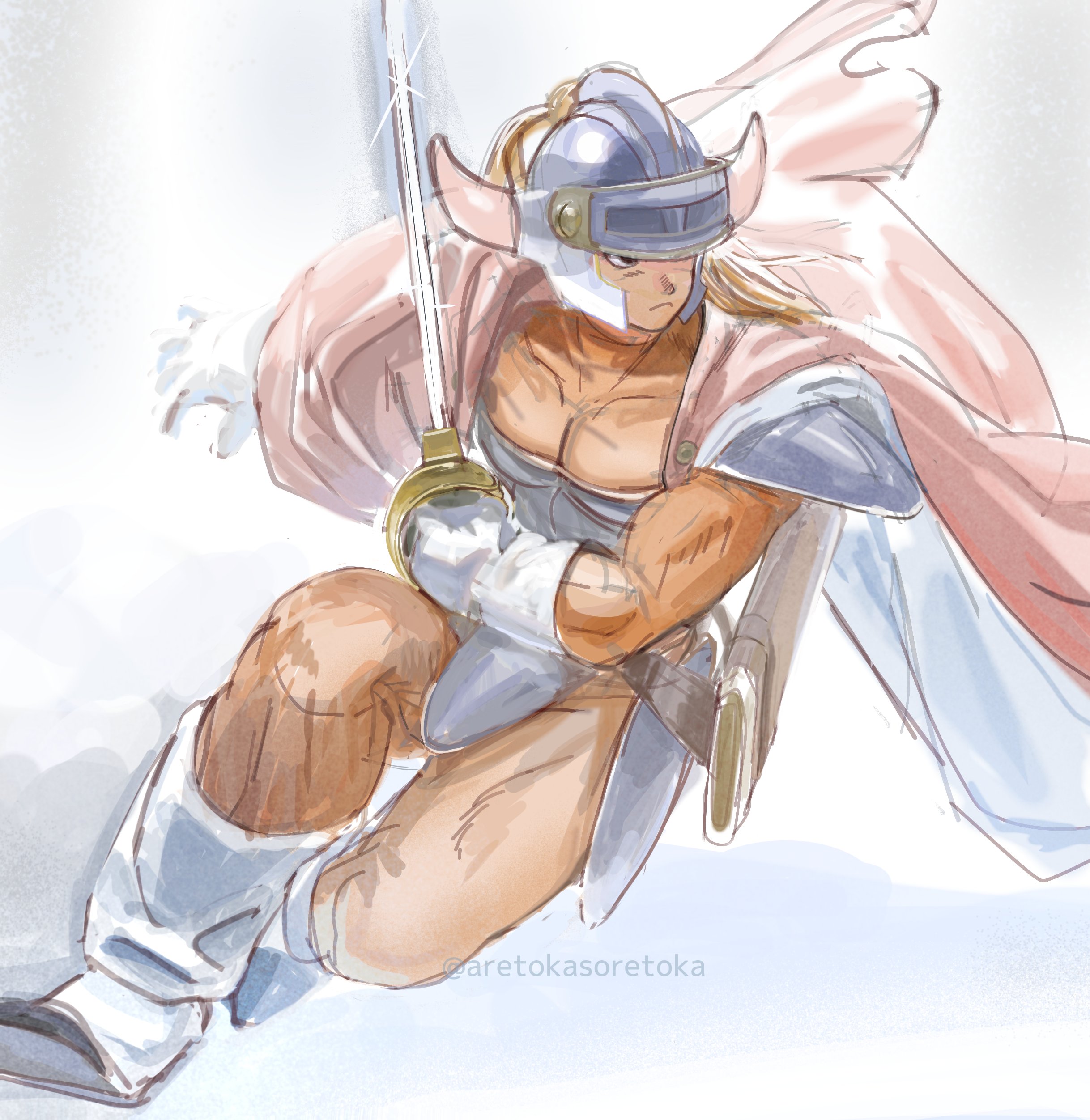 1boy absurdres aretokasoretoka armor black_eyes blue_armor blue_helmet bodysuit boots cape commentary covered_collarbone covered_pectorals dragon_quest dragon_quest_i fake_horns floating_cape frown gloves helmet hero_(dq1) highres holding holding_sword holding_weapon horned_helmet horns looking_to_the_side male_focus muscular muscular_male one_eye_covered orange_bodysuit pectorals red_cape red_horns scabbard sheath sketch solo sword twitter_username two-sided_cape two-sided_fabric weapon white_background white_boots white_cape