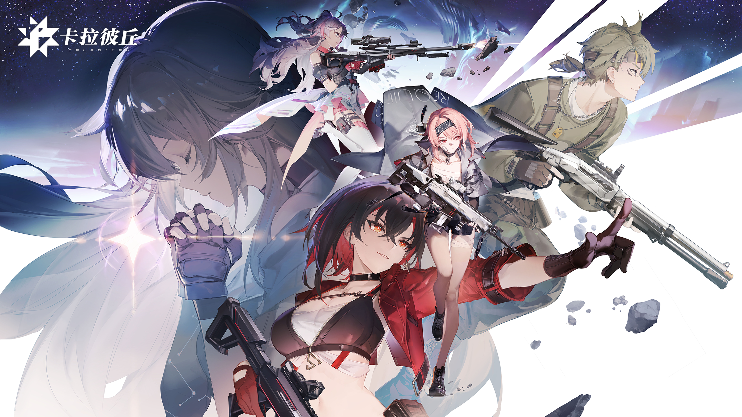 1boy 4girls bai_mo_(strinova) black_hair breasts celestia_(strinova) choker closed_eyes crop_top cropped_jacket diffraction_spikes floating_hair fuchsia_(strinova) gloves green_hair grin gun highres holding holding_gun holding_weapon jacket kanami_(strinova) large_breasts long_hair midriff ming_(strinova) multiple_girls navel official_art open_clothes open_jacket own_hands_clasped own_hands_together pink_hair praying red_jacket rifle short_hair smile sniper_rifle strinova weapon