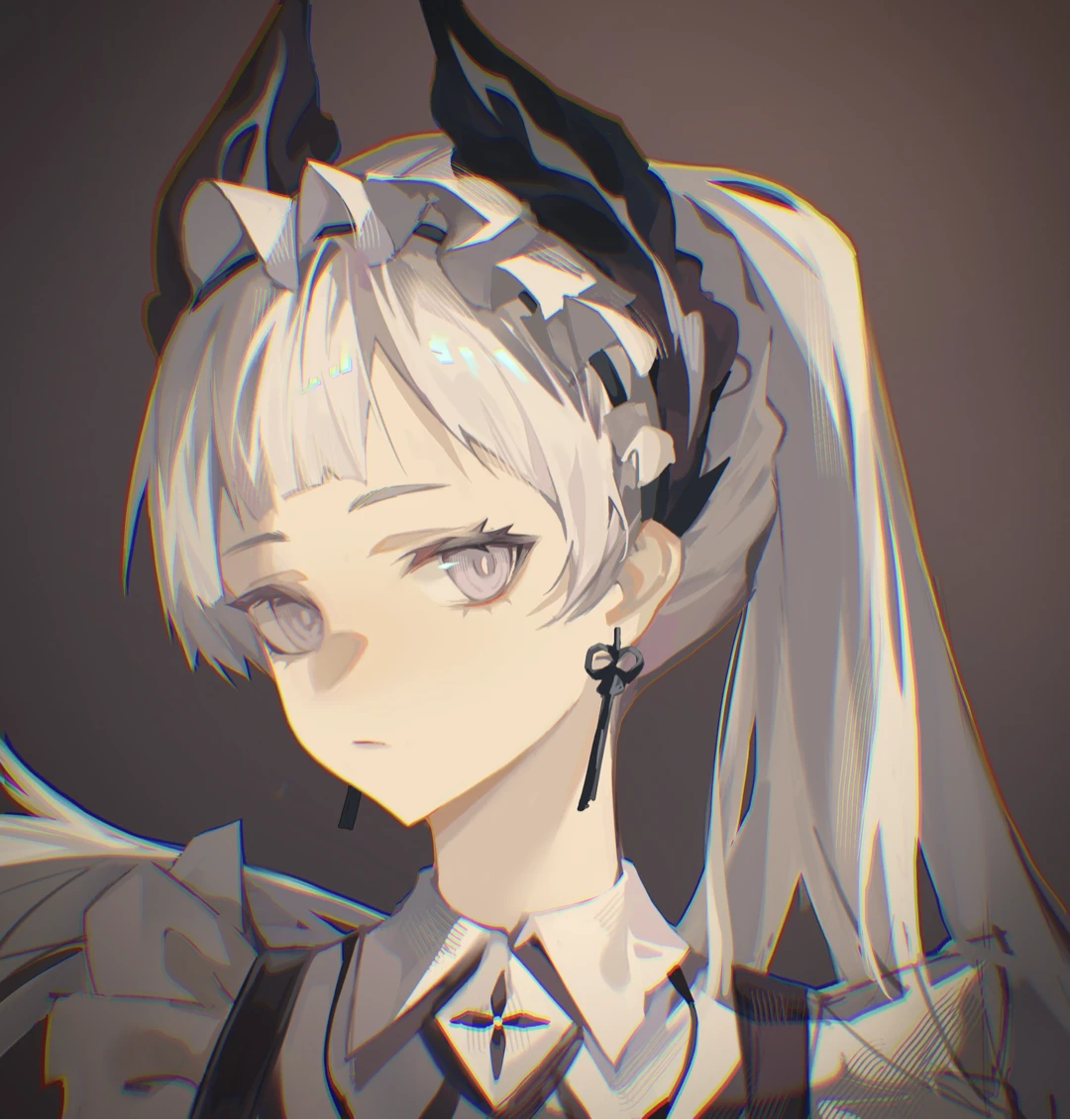 1girl ambience_synesthesia arknights brown_background chinese_commentary chromatic_aberration closed_mouth commentary_request earrings expressionless frills grey_eyes irene_(arknights) irene_(voyage_of_feathers)_(arknights) jewelry long_hair looking_at_viewer maid maid_headdress official_alternate_costume ponytail portrait solo white_hair zhuo_soleil