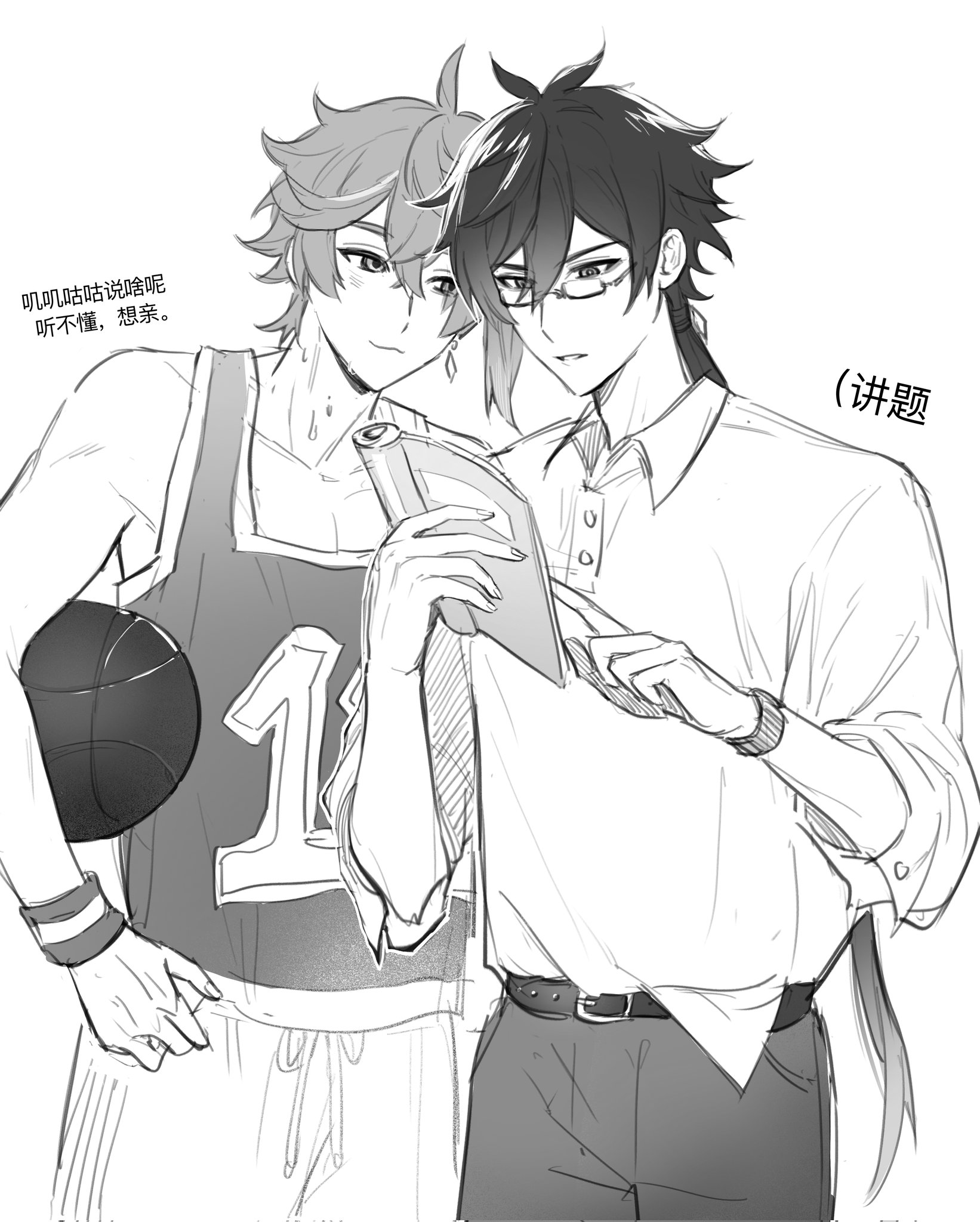 2boys alternate_costume ball basketball basketball_(object) book chinese_text contemporary genshin_impact glasses greyscale highres holding holding_book huachenchenchen jockey monochrome multiple_boys tartaglia_(genshin_impact) twitter white_background yaoi zhongli_(genshin_impact)