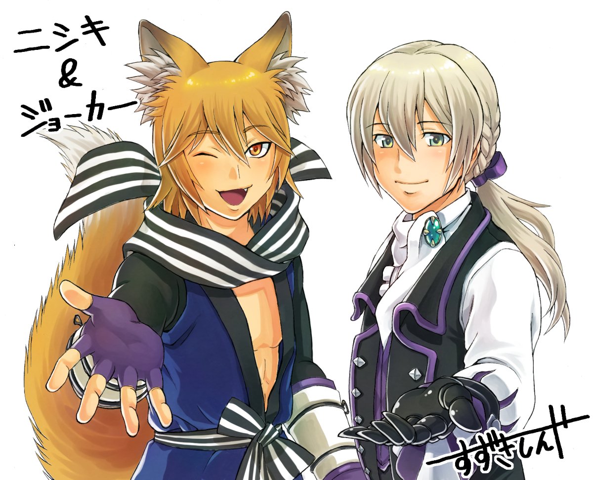 2boys animal_ears aristocratic_clothes butler fire_emblem fire_emblem_fates fox_boy fox_ears fox_tail grey_hair jakob_(fire_emblem) japanese_clothes kaden_(fire_emblem) kitsune long_hair low_ponytail male_focus multiple_boys nintendo open_mouth orange_eyes orange_fur orange_hair ponytail scarf shinya_sheep striped_clothes striped_scarf tail tuxedo_shirt white_fur