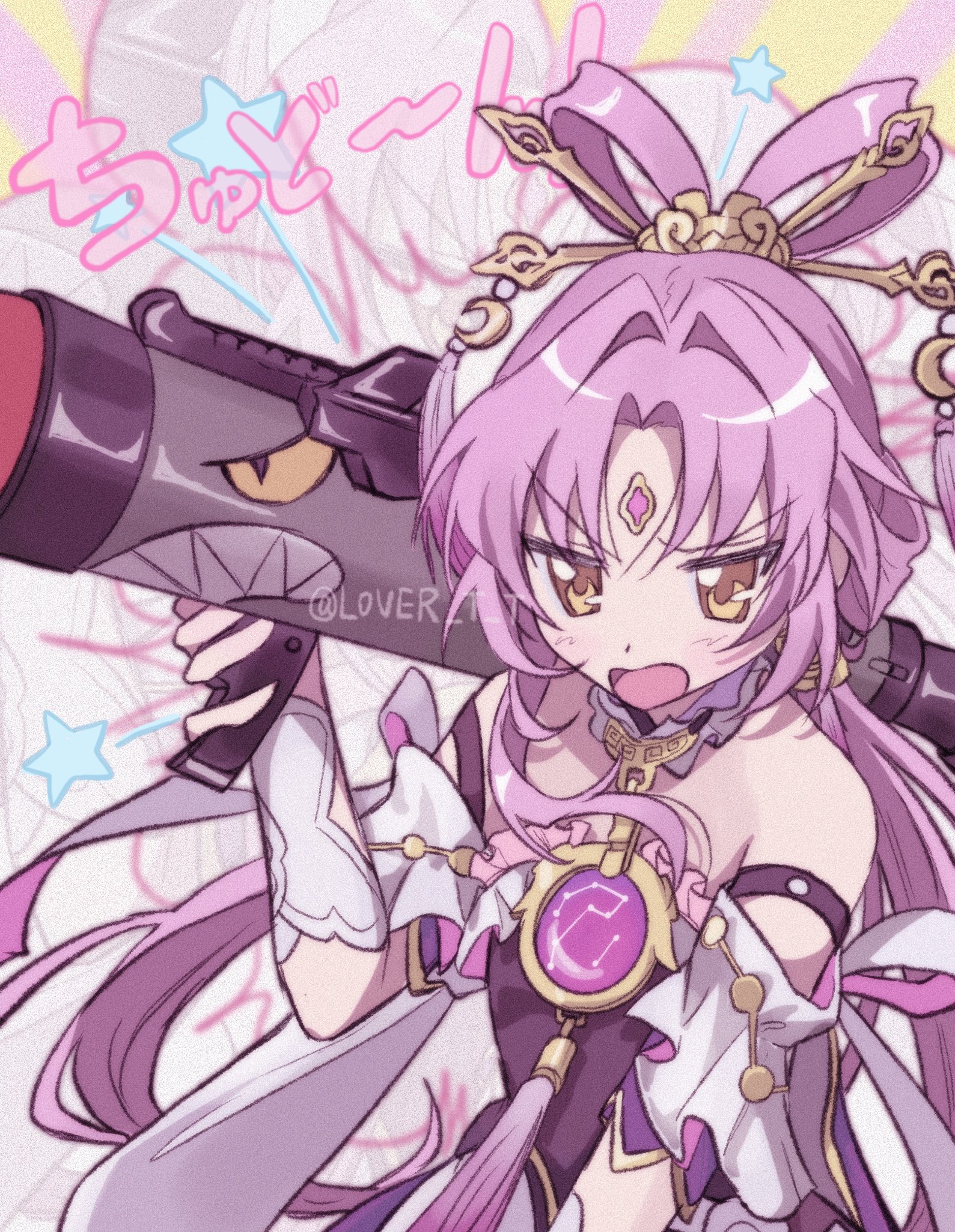 1girl bare_shoulders bow-shaped_hair flat_chest forehead_jewel fu_xuan_(honkai:_star_rail) gun highres holding holding_gun holding_weapon honkai:_star_rail honkai_(series) l0ver_t_t long_hair m1_bazooka open_mouth parted_bangs rocket_launcher sleeveless upper_body weapon yellow_eyes