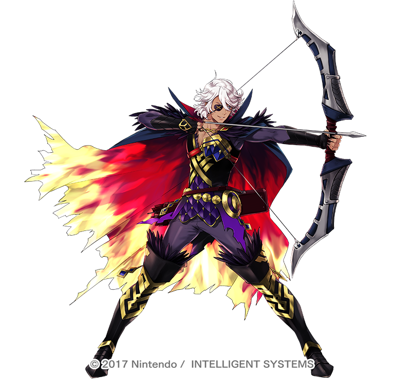 1boy 2017 aiming arrow_(projectile) black_footwear blue_eyes boots bow_(weapon) copyright_name eyepatch feather_trim fire_emblem fire_emblem_fates fire_emblem_heroes flame_print hair_between_eyes holding holding_bow_(weapon) holding_weapon knee_boots male_focus niles_(fire_emblem) niles_(resplendent)_(fire_emblem) nintendo official_alternate_costume official_art suekane_kumiko two-tone_cape weapon white_hair