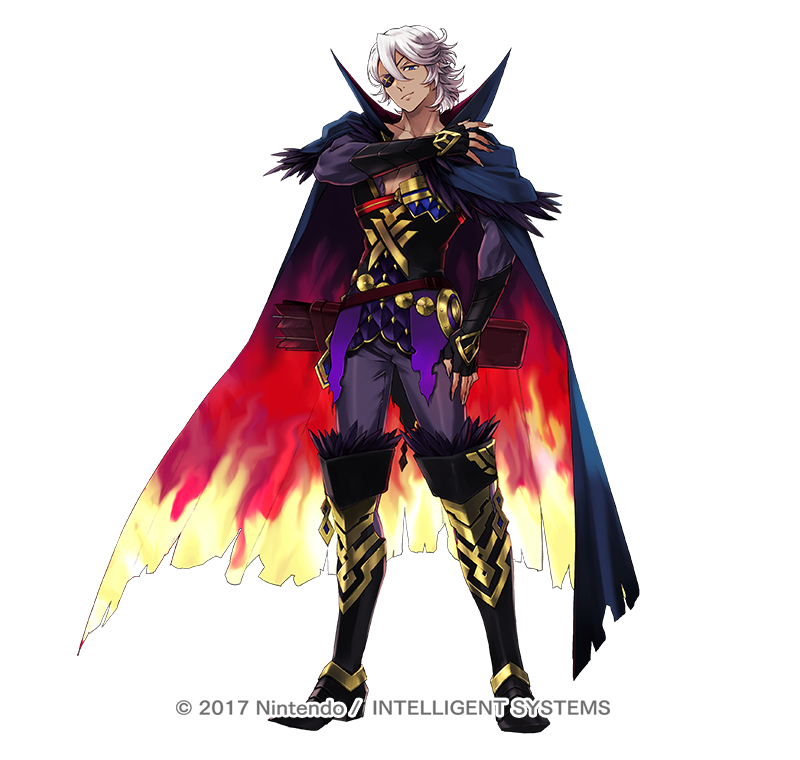 1boy 2017 black_footwear blue_eyes boots copyright_name eyepatch feather_trim fire_emblem fire_emblem_fates fire_emblem_heroes flame_print hair_between_eyes knee_boots male_focus niles_(fire_emblem) niles_(resplendent)_(fire_emblem) nintendo official_alternate_costume official_art suekane_kumiko two-tone_cape white_hair