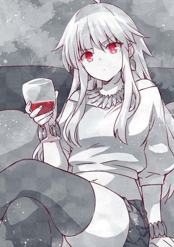 1girl ahoge alcohol casual closed_mouth cowboy_shot crossed_legs cup drinking_glass earrings fate/extra fate_(series) genderswap genderswap_(mtf) gilgamesh-ko gilgamesh_(fate) greyscale holding holding_cup jewelry midriff monochrome navel necklace off-shoulder_sweater off_shoulder sitting solo spot_color sweater thighhighs wine wine_glass yakan_(kusogaki_teikoku)