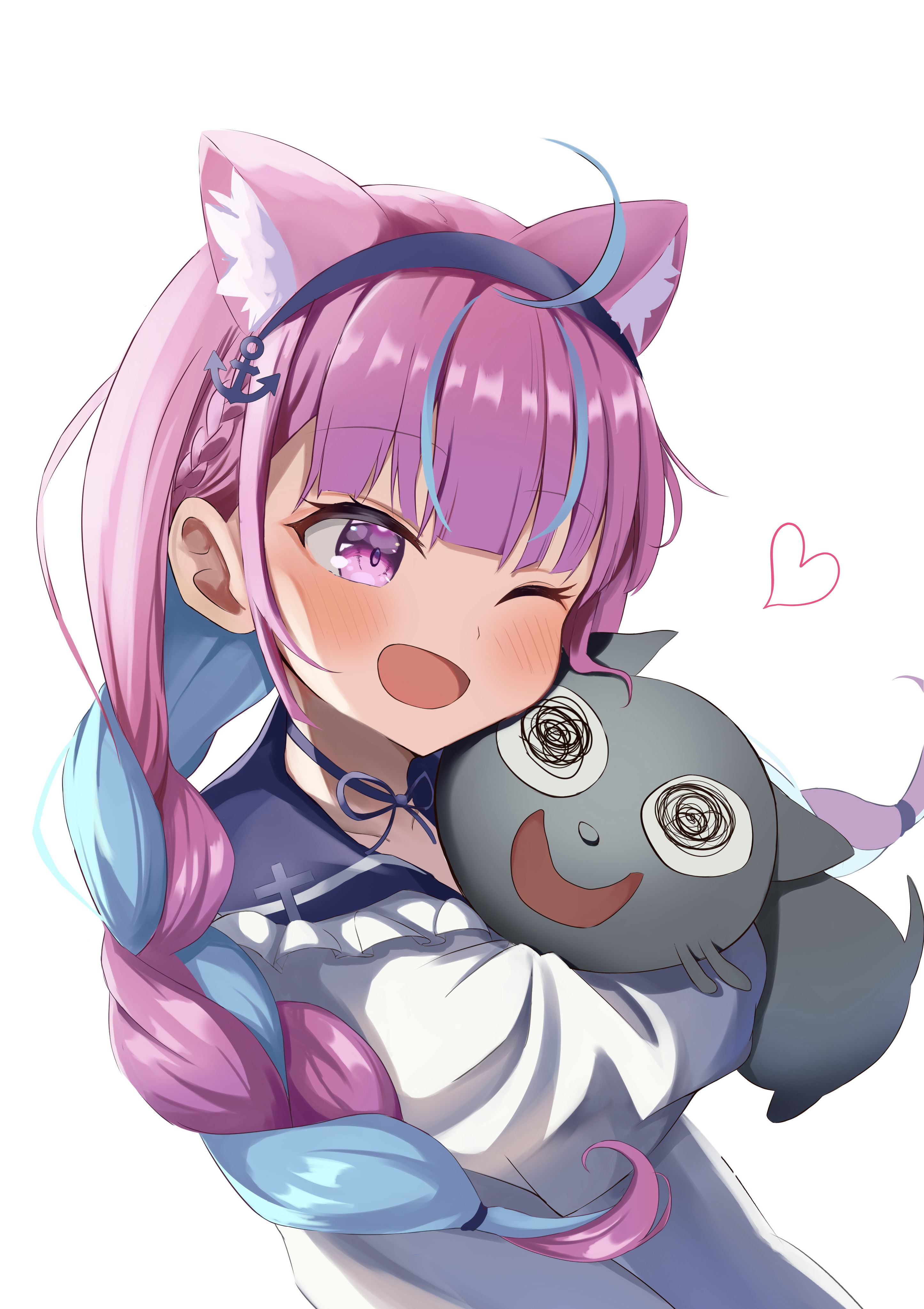 1girl ;d absurdres ahoge anchor_hair_ornament animal animal_ear_fluff animal_ears animal_hug blue_choker blue_hair blue_hairband blue_sailor_collar blunt_bangs blush braid cat cat_ears chino0803 choker commentary_request creature fanged_bangs frilled_sailor_collar frills hair_ornament hairband highres hololive jacket long_hair long_sleeves minato_aqua minato_aqua_(sailor) multicolored_hair neko_(minato_aqua) official_alternate_costume one_eye_closed open_mouth purple_eyes purple_hair ribbon_choker sailor_collar sidelocks smile solo streaked_hair twin_braids twintails two-tone_hair virtual_youtuber white_jacket