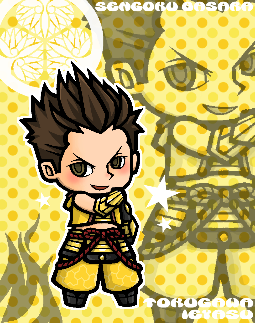 1boy :d asymmetrical_sleeves brown_eyes brown_hair character_name chibi chibi_only copyright_name full_body gauntlets hand_up hate0318 highres looking_at_viewer male_focus midriff mitsuba_aoi_(tokugawa_mon) open_mouth outline pants polka_dot polka_dot_background sengoku_basara smile solo spiked_hair standing tokugawa_ieyasu_(sengoku_basara) uneven_sleeves white_outline yellow_background yellow_pants zoom_layer