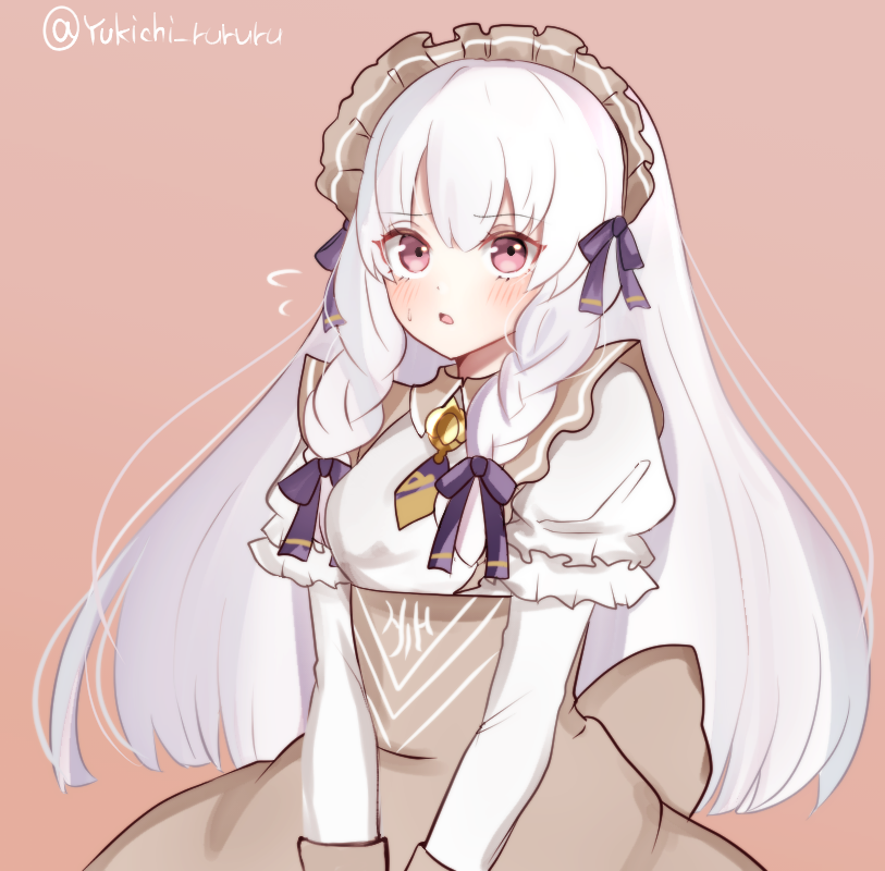 1girl apron blush braid brown_apron commentary_request dress fire_emblem fire_emblem:_three_houses fire_emblem_heroes flying_sweatdrops hair_ribbon long_hair long_sleeves looking_at_viewer lysithea_von_ordelia lysithea_von_ordelia_(tea_party) maid_headdress nintendo official_alternate_costume pink_background pink_eyes puffy_long_sleeves puffy_sleeves purple_ribbon ribbon simple_background solo twin_braids twitter_username waist_apron white_hair yukichi_(yukichi_rururu)