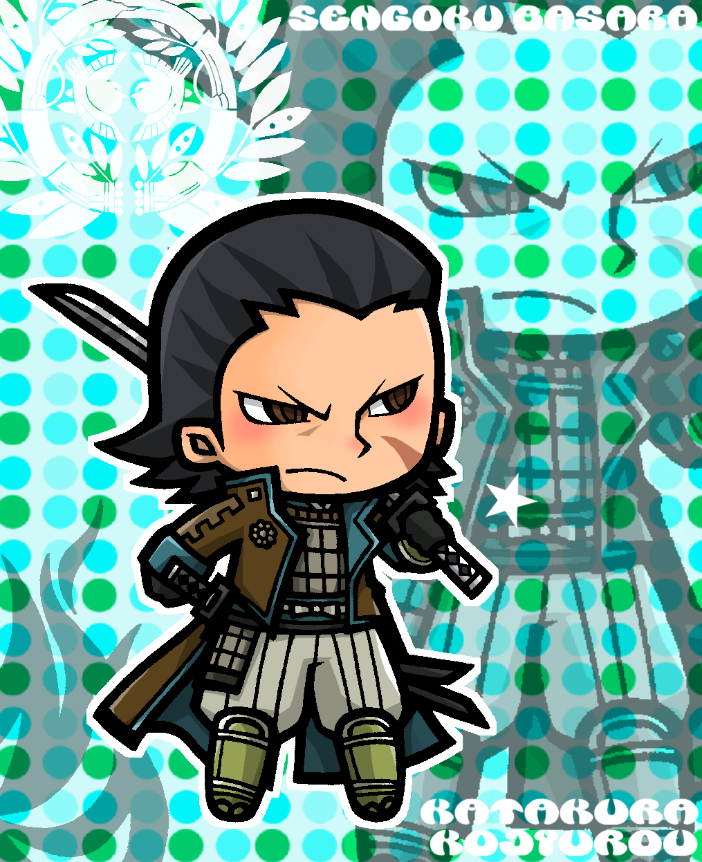 1boy aqua_background black_gloves black_hair brown_coat brown_eyes character_name chibi chibi_only coat copyright_name facial_scar frown full_body gloves grey_pants hair_slicked_back hate0318 highres holding holding_sword holding_weapon katakura_kojuurou_(sengoku_basara) katana looking_to_the_side male_focus outline over_shoulder pants polka_dot polka_dot_background scar scar_on_cheek scar_on_face sengoku_basara short_hair solo standing sword v-shaped_eyebrows weapon weapon_over_shoulder white_outline zoom_layer