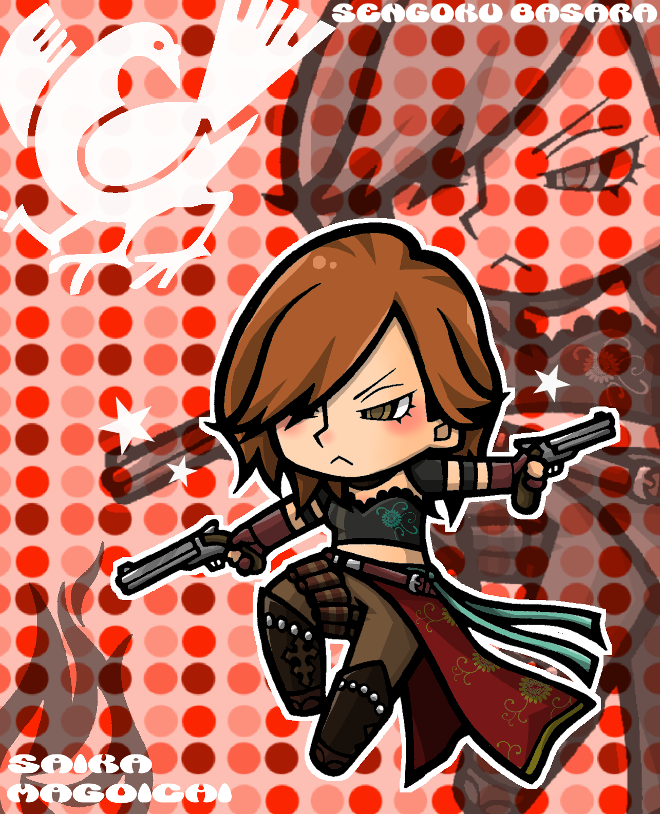 1girl :< brown_pants character_name chibi chibi_only copyright_name crop_top detached_sleeves dual_wielding full_body gun hair_over_one_eye handgun hate0318 highres holding holding_gun holding_weapon looking_ahead medium_hair midriff orange_hair outline pants polka_dot polka_dot_background saika_magoichi_(sengoku_basara) sengoku_basara short_sleeves solo v-shaped_eyebrows weapon white_outline yellow_eyes zoom_layer
