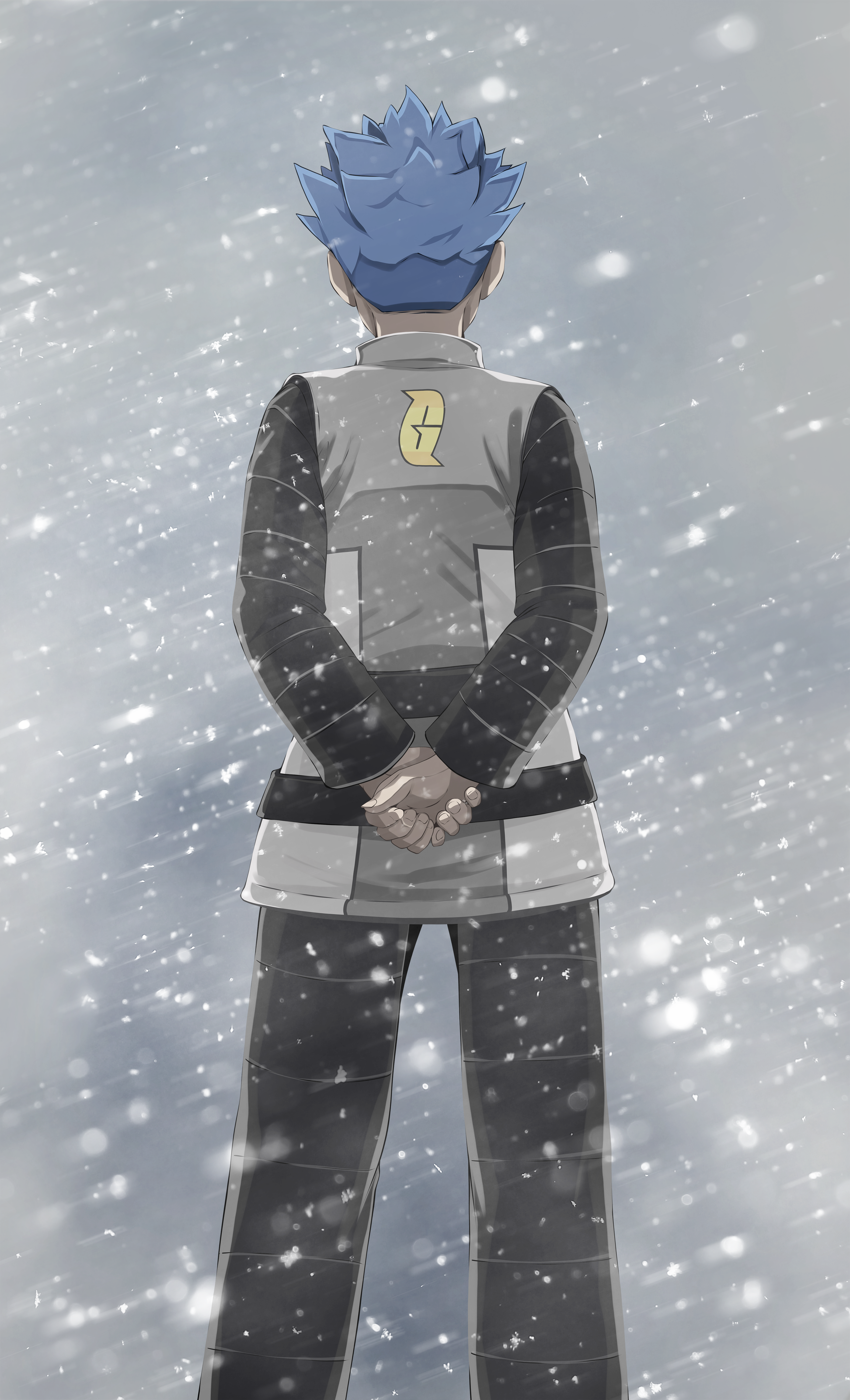 1boy absurdres arms_behind_back blue_hair cyrus_(pokemon) facing_away highres nintendo pokemon pokemon_diamond/pearl/platinum snow snowing solo team_galactic tsukishiro_saika variant_set