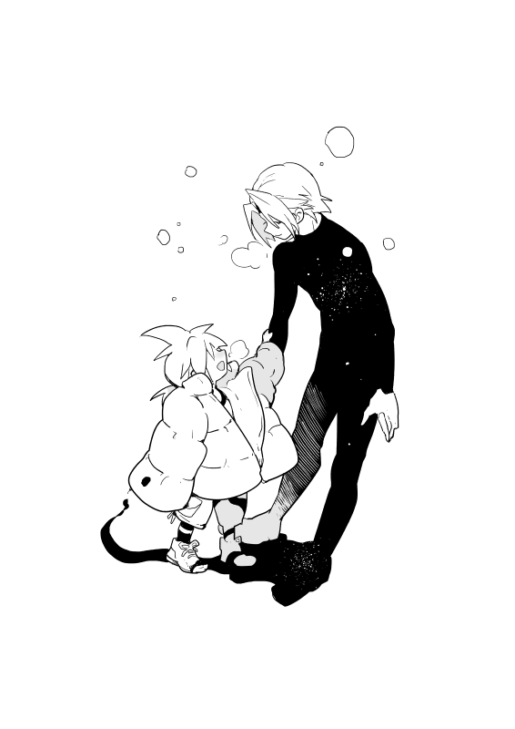 2boys age_difference borrowed_clothes breath cloud_strife cold final_fantasy final_fantasy_vii final_fantasy_vii:_ever_crisis full_body greyscale hand_on_another's_arm happy height_difference jacket light_blush light_smile long_hair long_sleeves looking_at_another looking_down looking_up low_ponytail male_focus monochrome multiple_boys no_gloves open_clothes open_jacket open_mouth outdoors oversized_clothes ponytail sephiroth sephiroth_(ever_crisis) sephiroth_(natant_jacket) shadow short_hair short_ponytail shorts simple_background smile spiked_hair standing white_background wxz