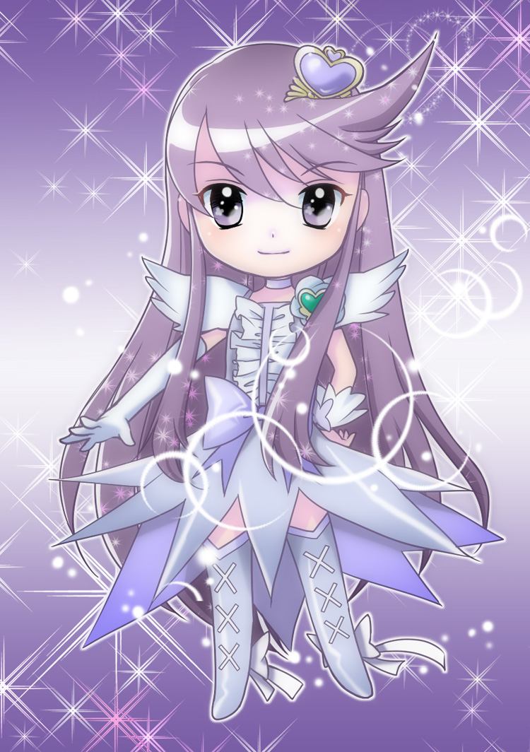 10s 1girl ahoge boots bow brooch chibi choker cure_moonlight cure_moonlight_(super_silhouette) dress elbow_gloves female_focus frills full_body gloves hair_ornament hairpin hand_on_own_hip heart heart_brooch heart_hair_ornament heartcatch_precure! hip_focus jewelry long_hair lovelabo magical_girl precure purple_eyes purple_hair ribbon single_elbow_glove single_glove smile solo sparkle tsukikage_yuri waist_bow white_choker wrist_cuffs