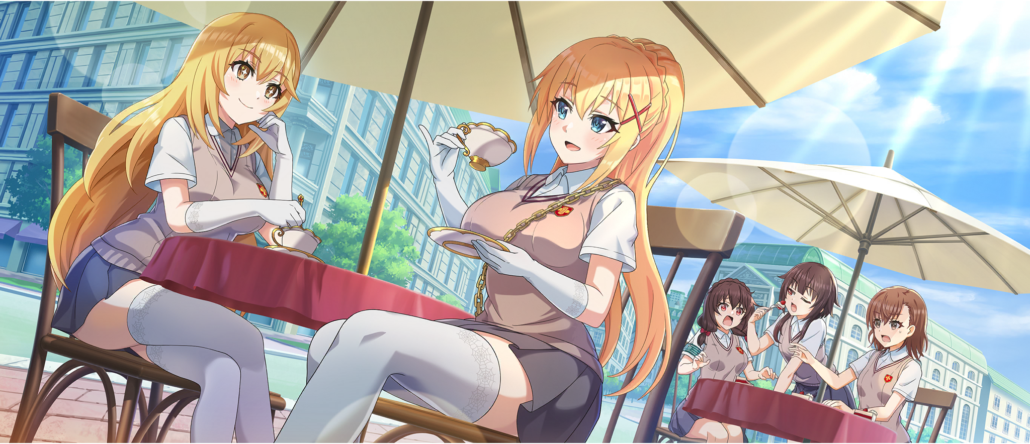 5girls armband asymmetrical_bangs blonde_hair blue_eyes blue_sky braid breasts brown_eyes brown_hair brown_sweater_vest cake cake_slice chain chair city collared_shirt cosplay crossed_legs crossover crown_braid cup darkness_(konosuba) day elbow_gloves emblem eye_contact food fork game_cg gloves gold_chain green_armband grey_skirt hair_between_eyes hair_ornament hand_on_own_cheek hand_on_own_face hands_up highres holding holding_cup holding_fork holding_saucer judgement_armband_(toaru) kono_subarashii_sekai_ni_shukufuku_wo! konosuba!_fantastic_days large_breasts long_hair looking_at_another low_twintails matching_outfits medium_hair megumin miniskirt misaka_mikoto misaka_mikoto_(cosplay) multiple_girls official_art on_chair open_mouth outdoors pinky_out pleated_skirt ponytail ponytail_with_braided_base red_eyes saucer school_emblem school_uniform shirai_kuroko shirai_kuroko_(cosplay) shirt shokuhou_misaki shokuhou_misaki_(cosplay) short_hair short_hair_with_long_locks short_sleeves sidelocks sitting skirt sky small_breasts smile spider_web_print star-shaped_pupils star_(symbol) summer_uniform sunlight sweater_vest symbol-shaped_pupils teacup thighhighs thighs toaru_kagaku_no_railgun toaru_majutsu_no_index tokiwadai_school_uniform twintails umbrella very_long_hair white_gloves white_thighhighs x_hair_ornament yellow_eyes yunyun_(konosuba) zettai_ryouiki