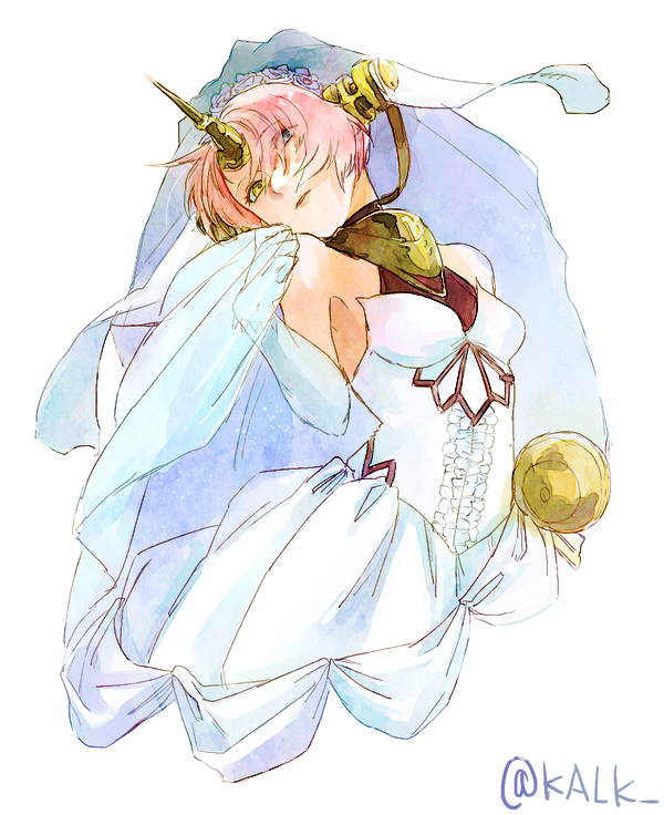 1girl blue_eyes breasts bridal_veil bride detached_sleeves dress fate/grand_order fate_(series) frankenstein's_monster_(fate) frankenstein's_monster_(fate/apocrypha) heterochromia horns kalk pink_hair short_hair single_horn small_breasts solo veil wedding_dress yellow_eyes