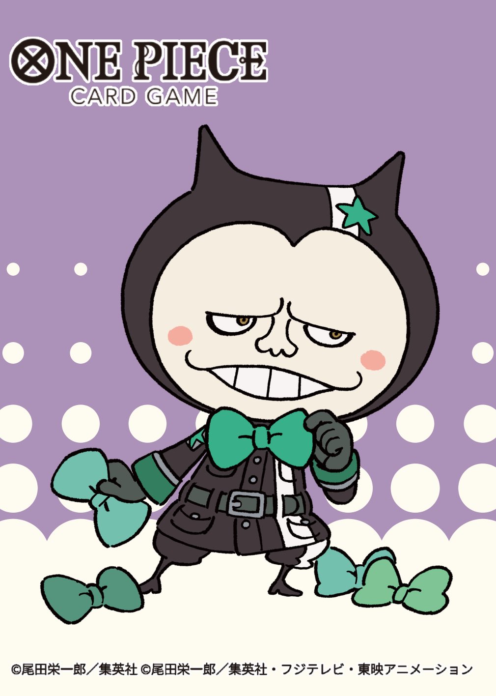 1boy belt black_coat blush_stickers bow bowtie coat commentary_request copyright_name full_body gloves green_bow highres hood hooded_coat looking_to_the_side male_focus naka29maru official_art one_piece one_piece_card_game one_piece_film:_gold purple_background smile solo_focus tanaka_(one_piece)