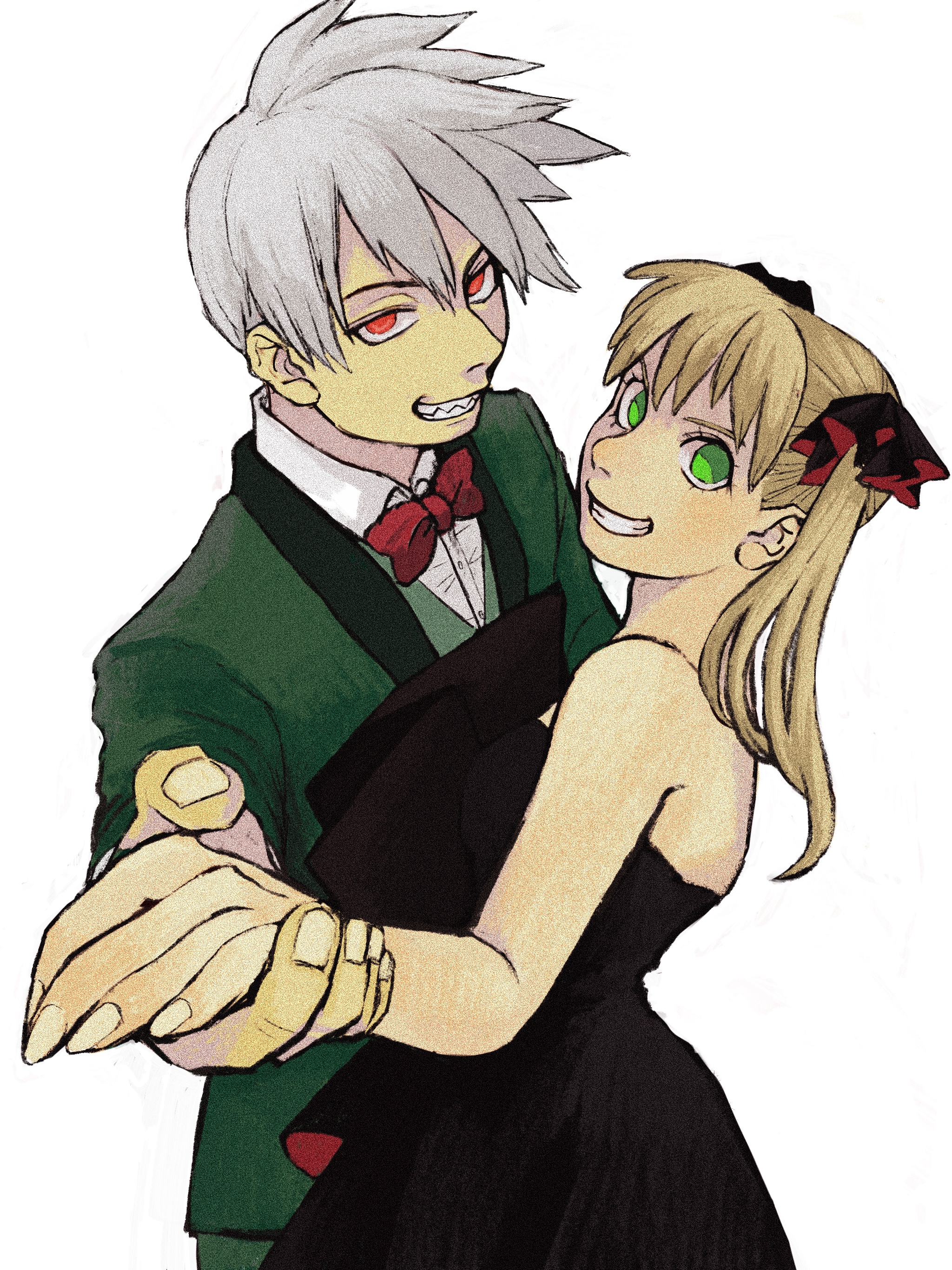 1boy 1girl absurdres black_dress blonde_hair bow bowtie collared_shirt commentary_request dress green_eyes green_jacket hair_between_eyes highres holding_hands jacket longlong_tail looking_at_viewer maka_albarn red_bow red_bowtie red_eyes sharp_teeth shirt simple_background smile soul_eater soul_evans spiked_hair teeth twintails white_background white_hair