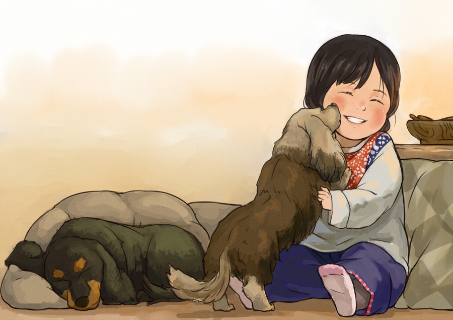 1girl animal blush bowl brown_hair child closed_eyes couch dog female_focus grin kotatsu licking original shibasaki_shouji sitting sleeping smile socks solo table