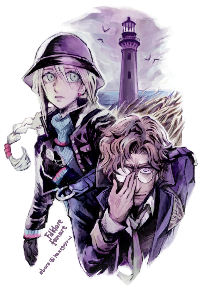 1boy 1girl adjusting_eyewear artist_name beard_stubble black_gloves blue_sweater braid braided_ponytail brown_hair cloche_hat coat earrings ellen_(folkssoul) facial_hair folkssoul glasses gloves green_eyes hat jacket jewelry keats_(folkssoul) lighthouse locket mustache_stubble oboro_(kazegoyomi) pendant ponytail purple_coat signature simple_background single_earring stubble sweater