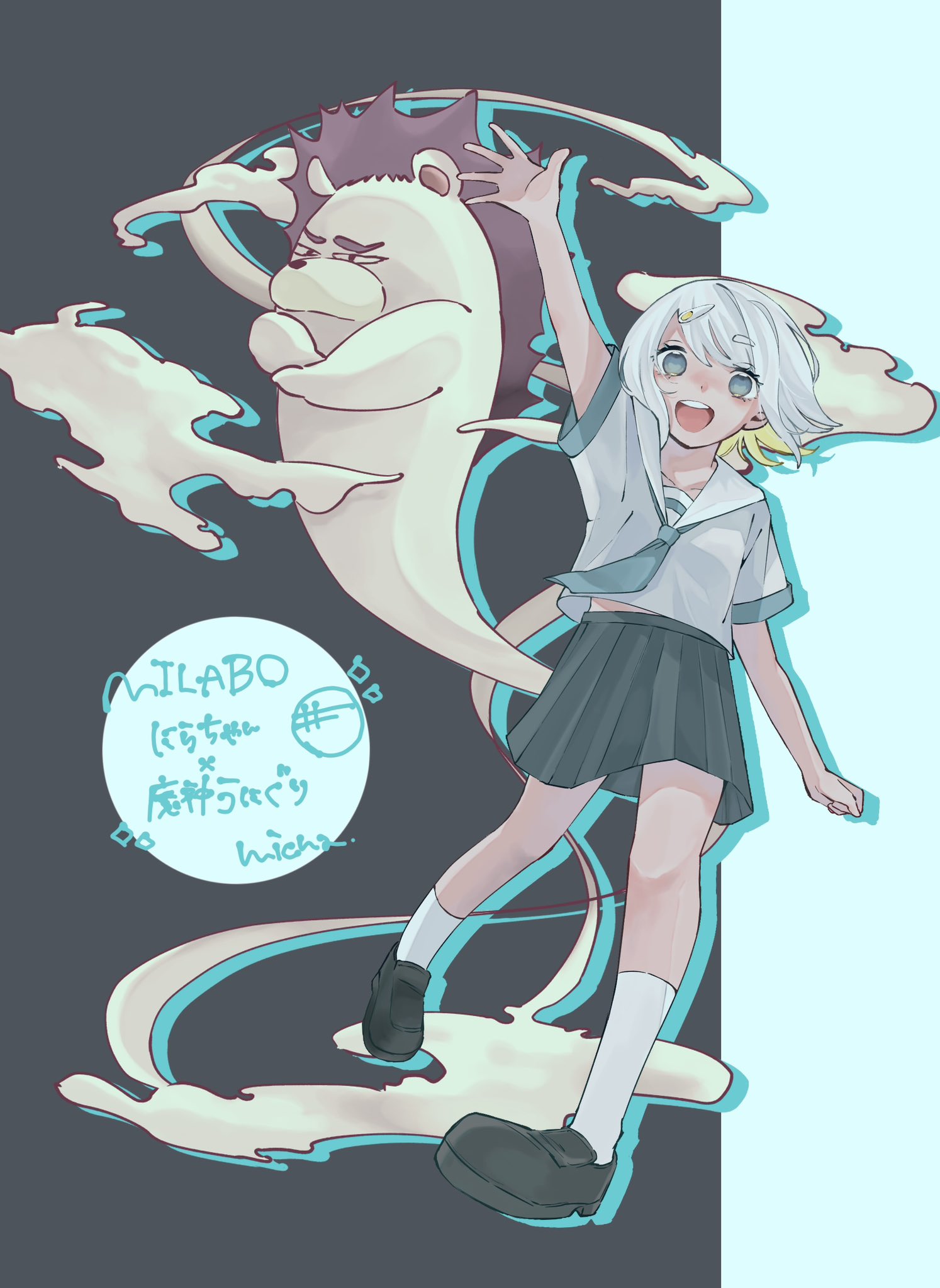 1girl :d aqua_necktie aqua_trim black_footwear black_skirt blonde_hair blue_eyes character_name colored_inner_hair crossed_arms grey_shirt hair_ornament hairclip hand_up hedgehog highres milabo_(zutomayo) multicolored_hair necktie nira-chan nira-chan_(milabo)_(zutomayo) open_mouth sailor_collar school_uniform serafuku sharrard_cole shirt skirt smile smoke socks song_name two-tone_background uniguri_(zutomayo) white_hair white_sailor_collar white_socks zutto_mayonaka_de_ii_no_ni