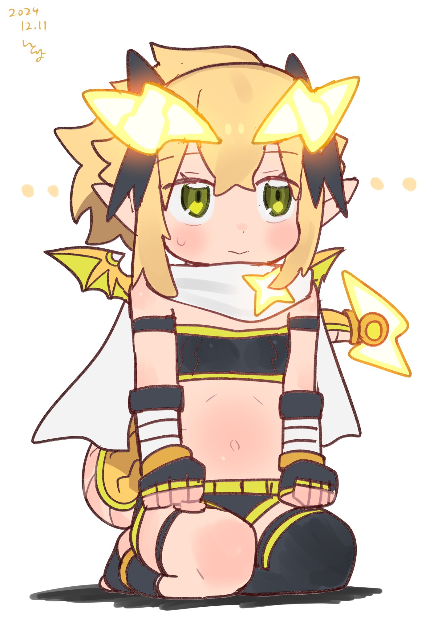 1girl aged_down black_gloves black_thighhighs blonde_hair breasts crossed_bangs dragon_girl dragon_horns dragon_tail dragon_wings fingerless_gloves gloves green_eyes hair_between_eyes hair_ornament hands_on_own_hips highres horns itoryo lightning_bolt lightning_bolt_hair_ornament lightning_bolt_symbol long_hair navel original pointy_ears ponytail raisei_no_ryuu_tsukai san-chan sidelocks simple_background single_thighhigh small_breasts solo strapless sweat tail thighhighs tube_top white_background wings
