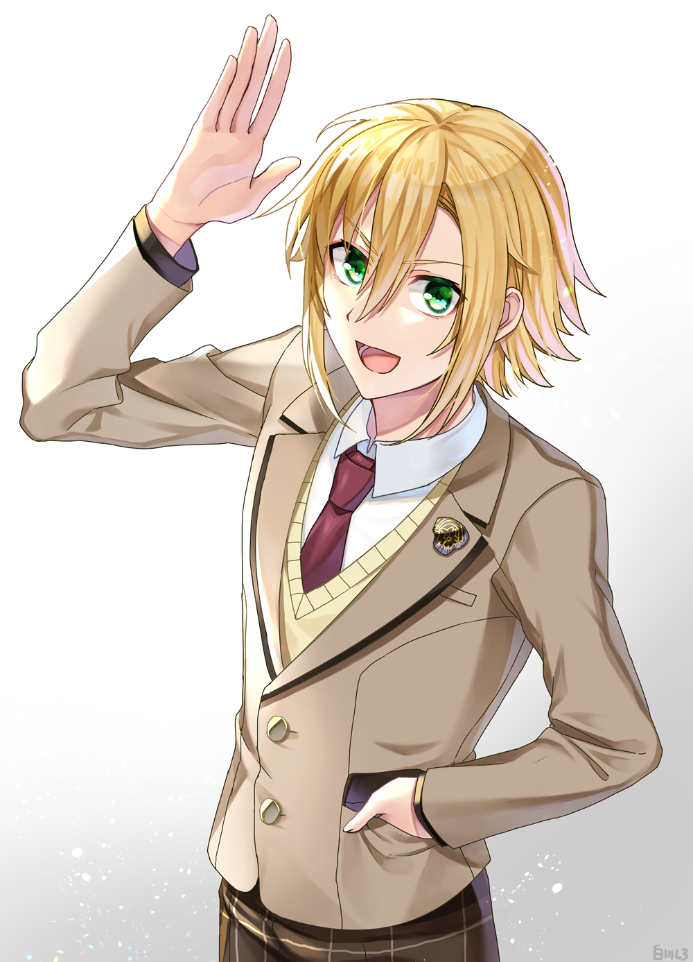 1boy blonde_hair checkered_clothes checkered_pants collared_shirt gradient_background green_eyes hand_in_pocket highres jacket looking_back male_focus necktie nijisanji pants red_necktie shirotoge shirt simple_background solo sweater_vest upper_body uzuki_kou uzuki_kou_(3rd_costume) virtual_youtuber waving white_background white_shirt