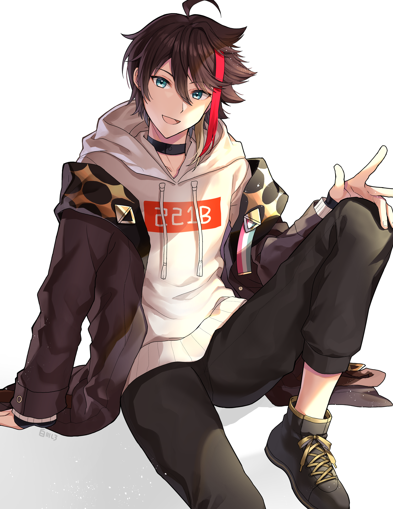 1boy black_choker black_footwear black_pants blue_eyes brown_hair choker drawstring highres hood hood_down hoodie jacket knee_up looking_at_viewer male_focus multicolored_hair nijisanji open_clothes open_jacket open_mouth pants red_hair saegusa_akina saegusa_akina_(1st_costume) shirotoge shoelaces simple_background sitting solo virtual_youtuber white_background white_hoodie