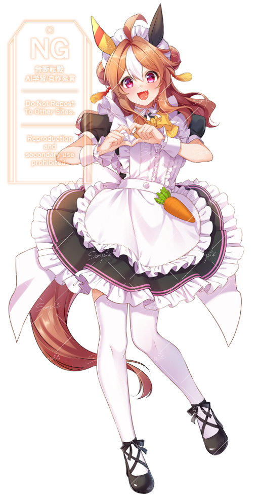 1girl :d ahoge alternate_costume animal_ears apron black_dress black_shoes blush brown_hair commentary_request copano_rickey_(umamusume) dress enmaided fang frilled_apron frilled_dress frills full_body hair_between_eyes heart heart_hands horse_ears horse_girl horse_tail long_hair looking_at_viewer maid maid_apron maid_headdress multicolored_hair open_mouth puffy_short_sleeves puffy_sleeves purple_eyes rukinya_(nyanko_mogumogu) shoes short_sleeves simple_background smile solo tail thighhighs two-tone_hair umamusume watermark white_apron white_background white_hair white_thighhighs wrist_cuffs