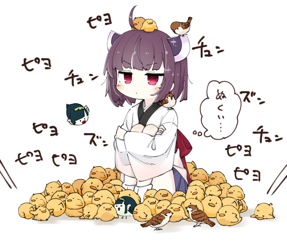 1girl ahoge animal animal_on_head baby_animal bird bird_on_head brown_hair chick japanese_clothes kimono knees_up konori_(ahurerukuiizi) medium_hair on_head red_eyes sitting sparrow too_many too_many_birds touhoku_kiritan touhoku_zunko translated twintails voiceroid white_background