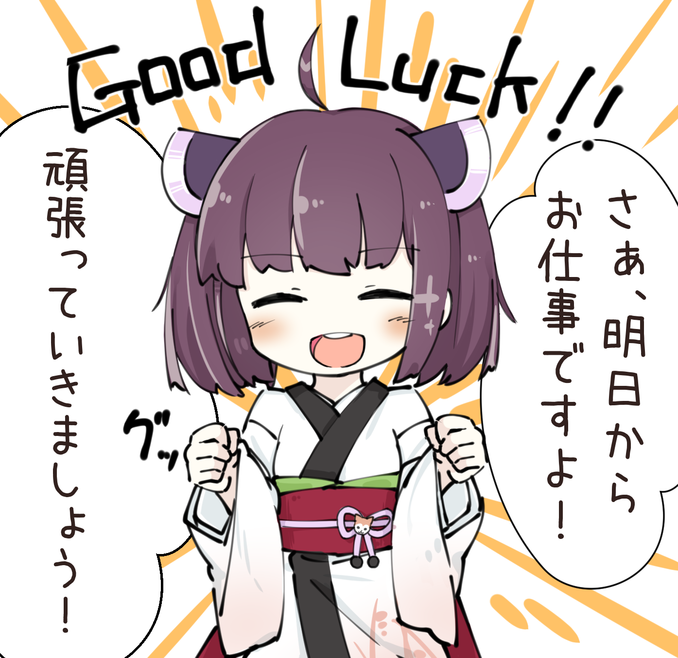 1girl :d ^_^ ahoge brown_hair closed_eyes highres japanese_clothes kimono konori_(ahurerukuiizi) medium_hair obi open_mouth sash simple_background smile solo teeth touhoku_kiritan translated twintails upper_teeth_only voiceroid