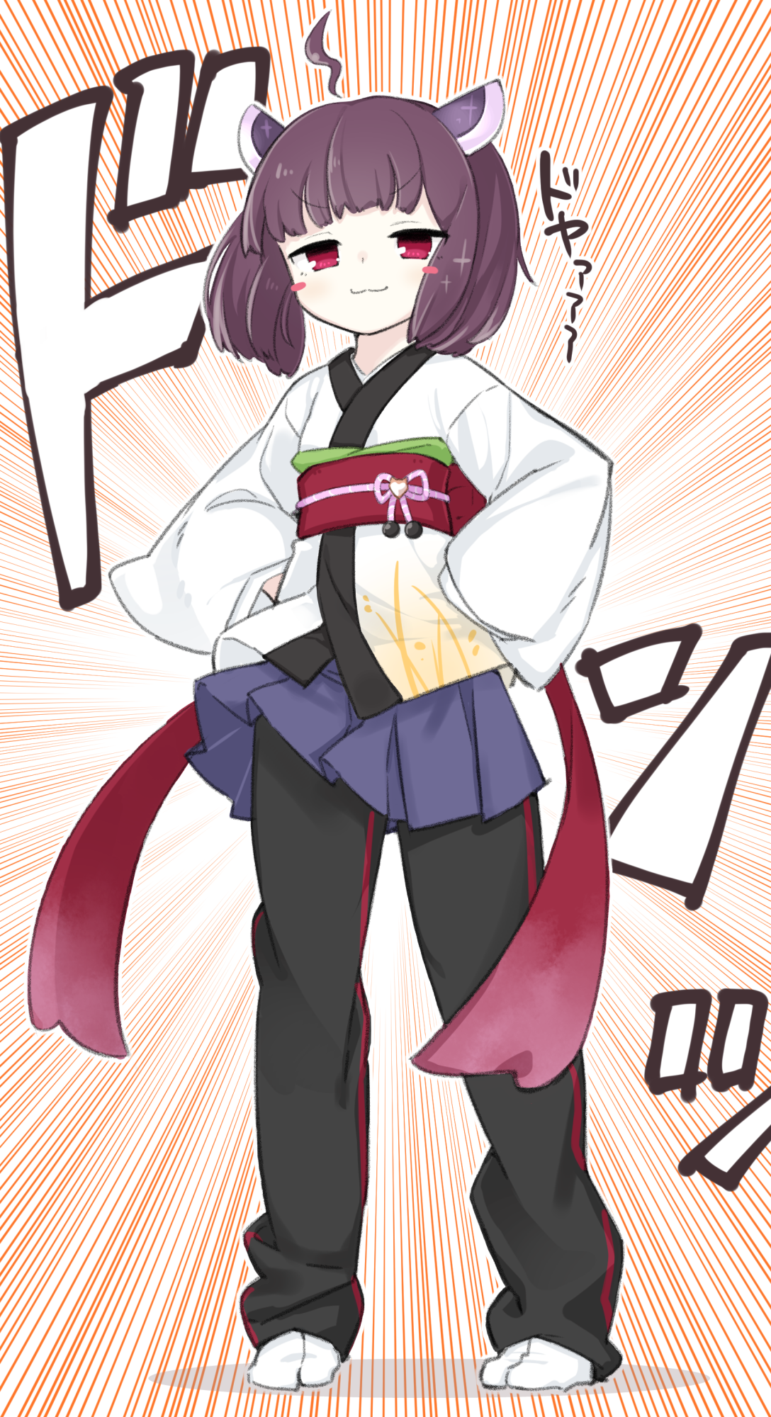 1girl :3 adapted_costume ahoge blush_stickers brown_hair doyagao hands_on_own_hips highres japanese_clothes kimono konori_(ahurerukuiizi) obi pants pants_under_skirt red_eyes sash smug solo tabi touhoku_kiritan track_pants voiceroid