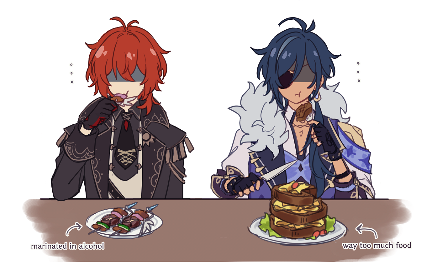 "once_upon_a_time_in_mondstadt"_(genshin_impact) ... 2boys :t antenna_hair armband arrow_(symbol) black_coat black_gloves black_necktie black_shirt blue_armband blue_hair blue_vest bracelet cleavage_cutout closed_mouth clothing_cutout coat collared_shirt commentary_request crossed_bangs dark-skinned_male dark_skin diluc_(genshin_impact) earrings eating english_text eyepatch faceless faceless_male fingerless_gloves food fruity_skewers_(genshin_impact) fur_trim genshin_impact gloves hair_between_eyes hair_over_shoulder hand_up holding holding_skewer jagaimo_(kakkoiiosi5) jewelry kaeya_(genshin_impact) lapels long_hair long_sleeves low_ponytail male_focus multicolored_hair multiple_boys necktie one_eye_covered open_clothes open_coat parted_bangs plate ponytail red_gloves red_hair shaded_face shirt sidelocks simple_background single_earring skewer sleeve_cuffs spiked_bracelet spikes streaked_hair swept_bangs table tassel two-tone_gloves upper_body vest white_background white_shirt white_vest wing_collar