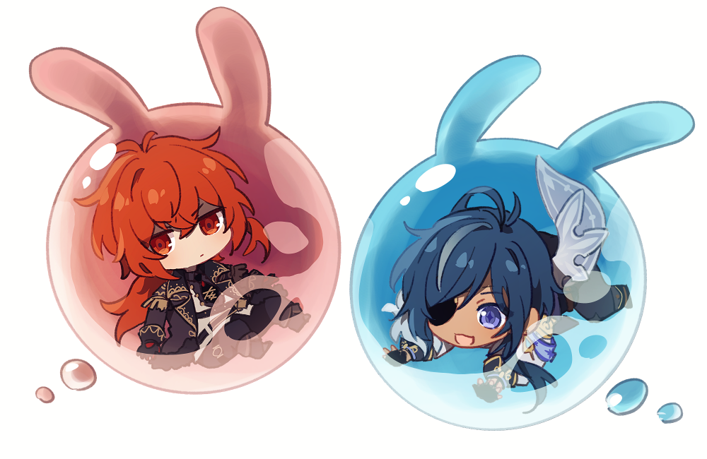 2boys :d antenna_hair armband belt black_belt black_coat black_footwear black_gloves black_necktie black_pants black_shirt blue_armband blue_eyes blue_hair blue_pants boots cape chibi closed_mouth coat collared_shirt commentary_request crossed_bangs dark-skinned_male dark_skin diluc_(genshin_impact) earrings eyepatch fingerless_gloves fold-over_boots fur-trimmed_coat fur_trim genshin_impact gloves grey_cape hair_between_eyes hair_over_shoulder jagaimo_(kakkoiiosi5) jewelry kaeya_(genshin_impact) lapels long_hair long_sleeves looking_at_viewer low_ponytail male_focus mini_person miniboy multicolored_hair multiple_boys necktie one_eye_covered open_clothes open_coat open_mouth outstretched_arms pants ponytail red_eyes red_gloves red_hair seelie_(genshin_impact) shirt sidelocks simple_background single_earring smile streaked_hair swept_bangs two-tone_gloves v-shaped_eyebrows vest white_background white_shirt white_vest