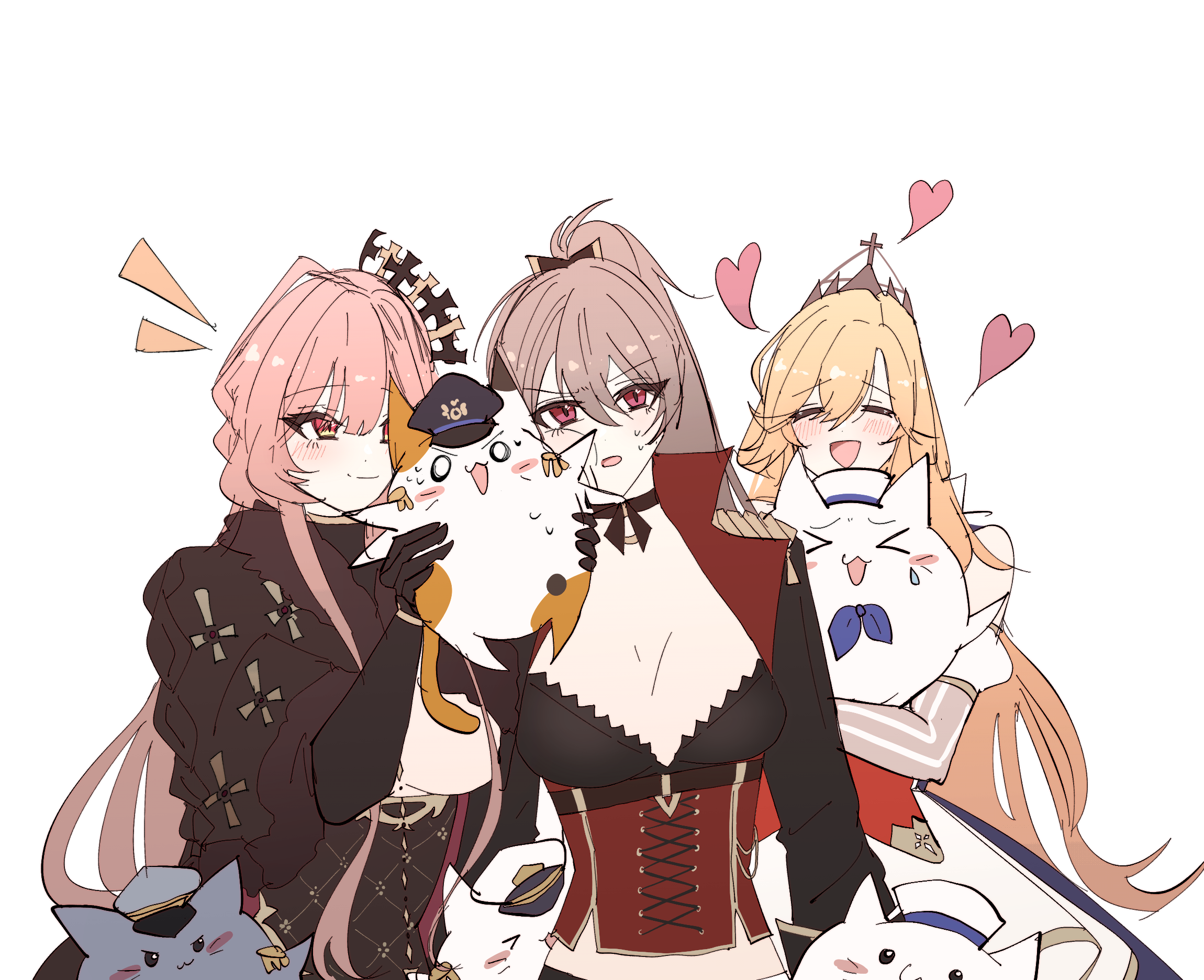 >_< 3girls :3 azur_lane brown_hair capelet clemenceau_(azur_lane) corset fur-trimmed_capelet fur_trim happy heart highres jean_bart_(azur_lane) juliet_sleeves long_hair long_sleeves meowfficer_(azur_lane) multiple_girls open_mouth orange_hair pink_hair puffy_sleeves red_corset red_eyes richelieu_(azur_lane) siblings simple_background sisters tsuchi_(xger4434) vertical-striped_sleeves very_long_hair white_background
