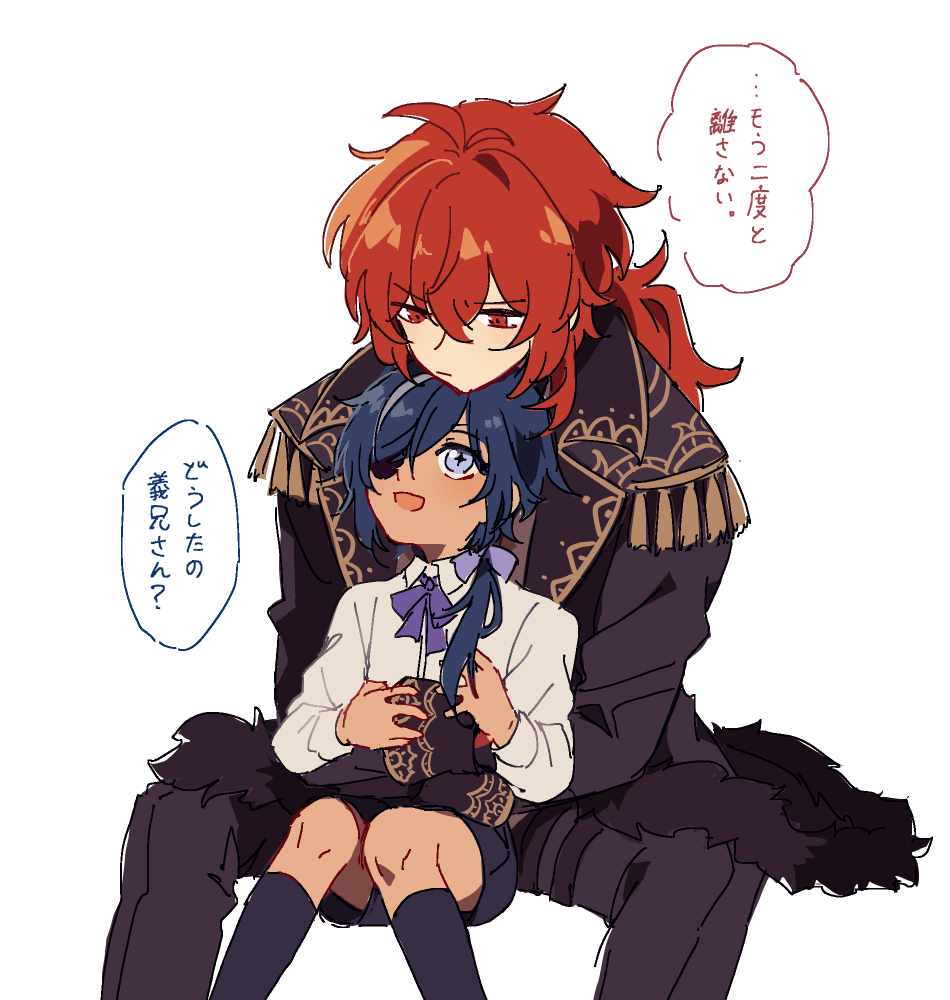 2boys :d aged_down antenna_hair black_coat black_pants black_shorts black_socks blue_eyes blue_hair brothers child closed_mouth coat collared_shirt commentary_request crossed_bangs dark-skinned_male dark_skin diluc_(genshin_impact) eyepatch fur-trimmed_coat fur_trim genshin_impact gold_trim hair_over_shoulder hair_ribbon jagaimo_(kakkoiiosi5) kaeya_(genshin_impact) kneehighs lapels long_hair long_sleeves looking_at_another looking_down looking_up low_ponytail male_focus multicolored_hair multiple_boys neck_ribbon one_eye_covered open_clothes open_coat open_mouth pants parted_bangs ponytail purple_ribbon red_eyes red_hair ribbon shirt short_shorts shorts siblings sidelocks simple_background sitting sleeve_cuffs smile socks speech_bubble step-siblings streaked_hair swept_bangs tassel translation_request v-shaped_eyebrows white_background white_shirt wing_collar