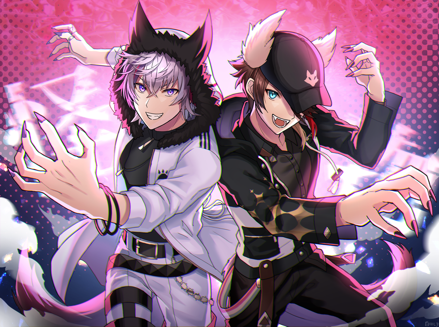 2boys animal_ears baseball_cap belt belt_buckle black_belt black_hat black_jacket black_pants black_shirt blue_eyes bracelet brown_hair buckle fake_claws fangs fur-trimmed_hood fur_trim fuwa_minato grey_hair hat hood hood_up jacket jewelry male_focus multicolored_hair multiple_boys nijisanji open_clothes open_jacket open_mouth pants pink_background purple_eyes purple_hair red_hair saegusa_akina shirotoge shirt tail upper_body virtual_youtuber white_jacket white_pants wolf_boy wolf_ears wolf_tail