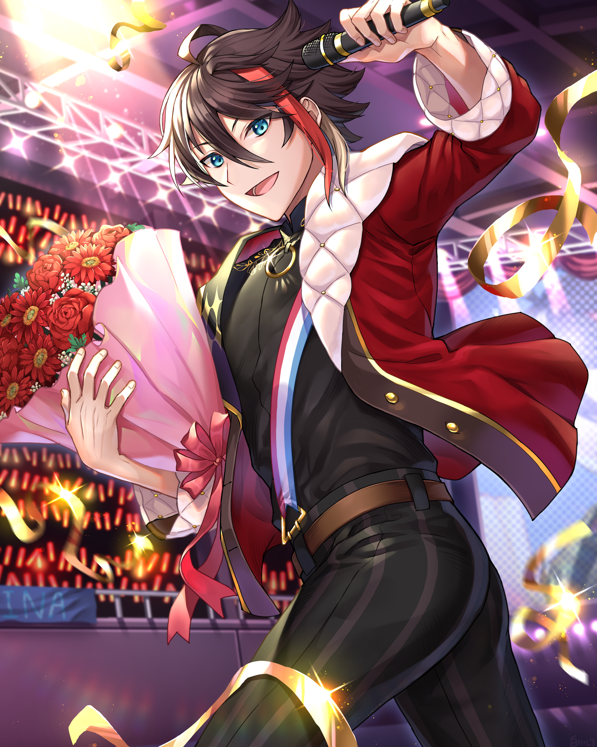 1boy absurdres belt black_pants black_shirt blue_eyes bouquet brown_belt brown_hair concert flower glowstick highres holding holding_bouquet holding_microphone idol jacket looking_at_viewer male_focus microphone multicolored_hair nijisanji o-ring open_clothes open_jacket open_mouth pants red_flower red_hair red_jacket saegusa_akina saegusa_akina_(2nd_costume) shirotoge shirt solo stage stage_lights standing striped_clothes striped_pants upper_body virtual_youtuber