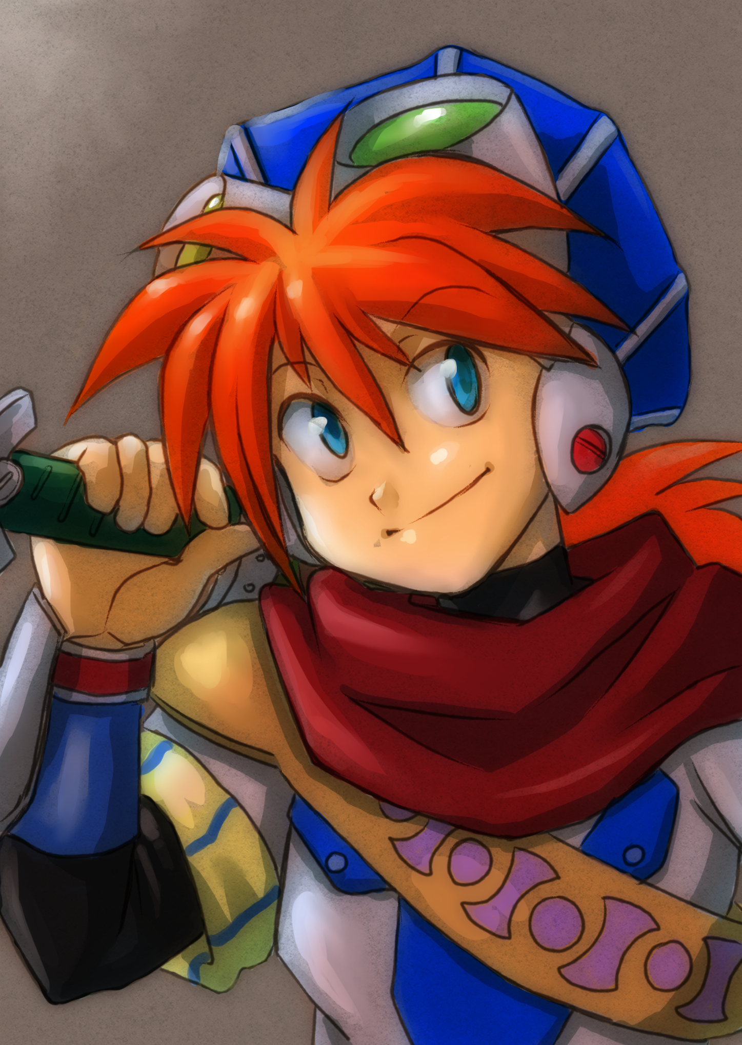 1boy blue_eyes blue_hat goggles goggles_on_headwear grandia grandia_i grey_background hat highres justin_(grandia) k_katora male_focus orange_hair red_scarf retro_artstyle scarf smile solo spiked_hair split_mouth sword sword_on_back weapon weapon_on_back
