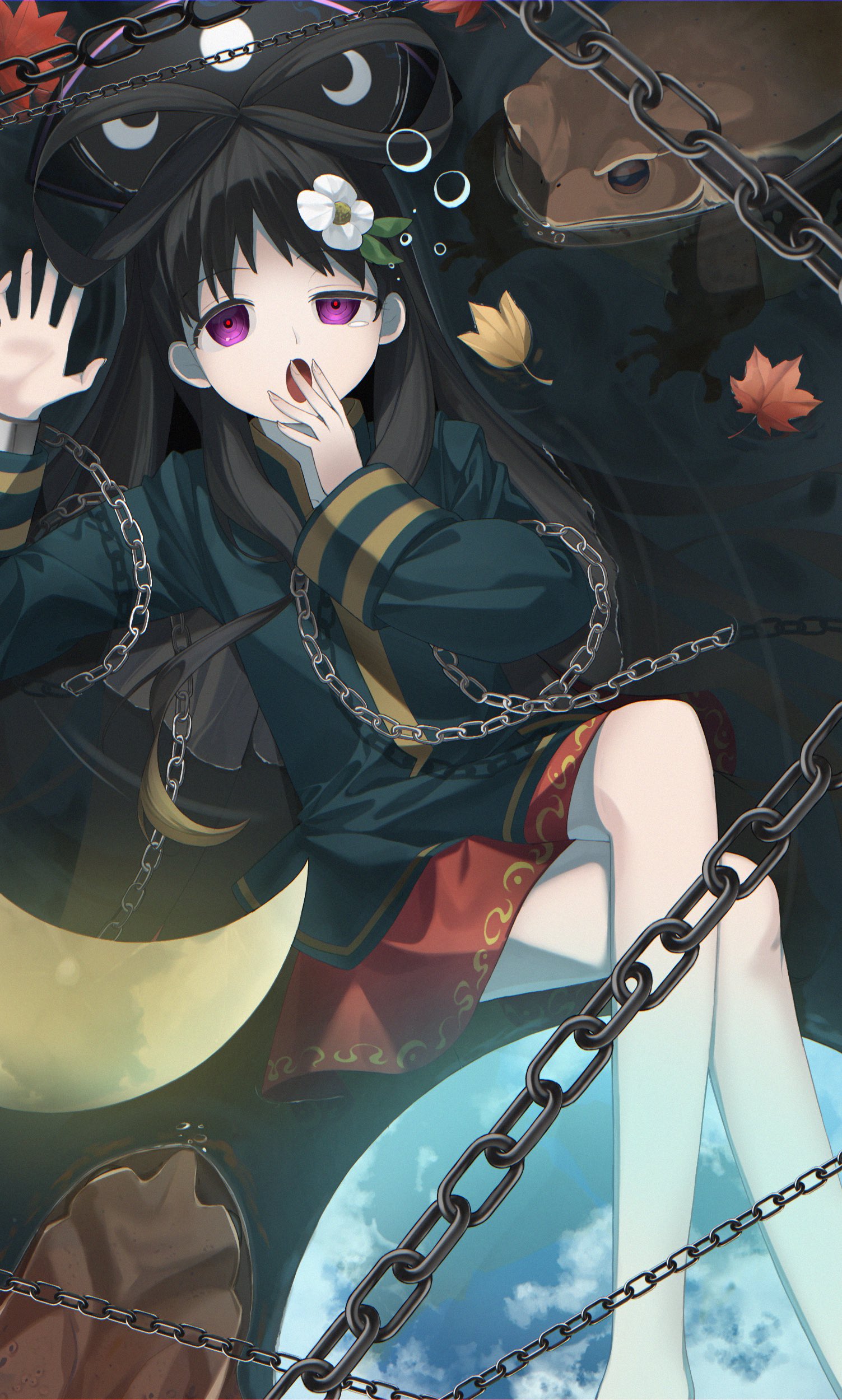 1girl absurdres afloat autumn_leaves black_hair chain chang'e chang'e_(touhou) clothing_request commentary_request crescent crescent_moon crossed_legs dalachi_(headdress) flower flower_request frog hair_flower hair_ornament hair_rings highres keiki8296 leaf long_hair long_sleeves looking_at_viewer moon moon_print open_mouth purple_eyes red_pupils red_skirt reflection ringed_eyes skirt solo touhou uneven_eyes very_long_hair water yawning