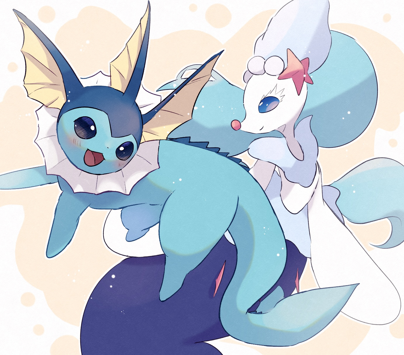 animal_focus blue_eyes blush commentary fins gen_1_pokemon gen_7_pokemon hat head_fins highres long_hair nintendo no_humans open_mouth pio_(piopio_poke) pokemon pokemon_(creature) primarina smile vaporeon